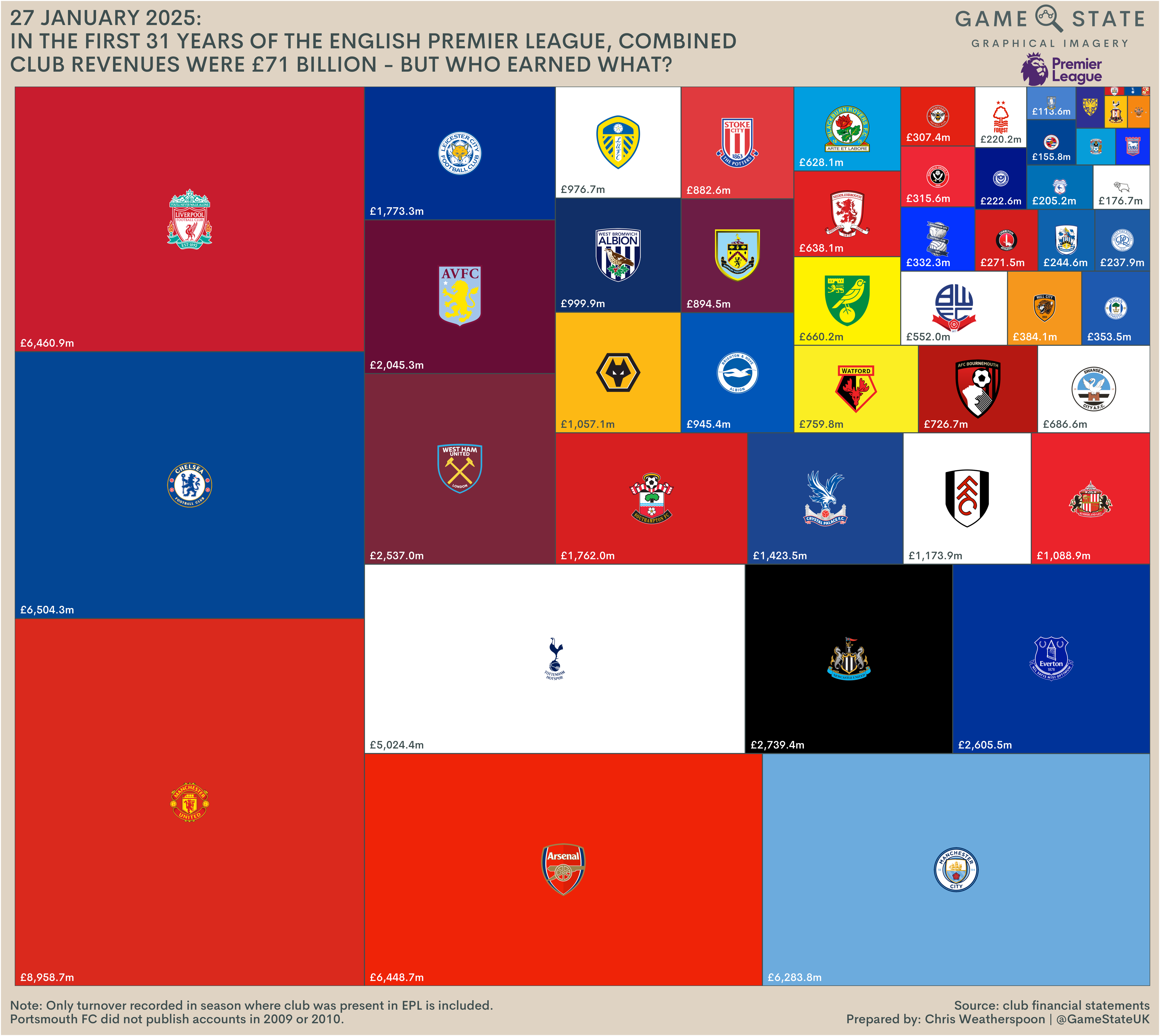 Graphical Imagery #12: In the first 31 years of the English Premier League, combined club revenues were £71 billion - but who earned what?