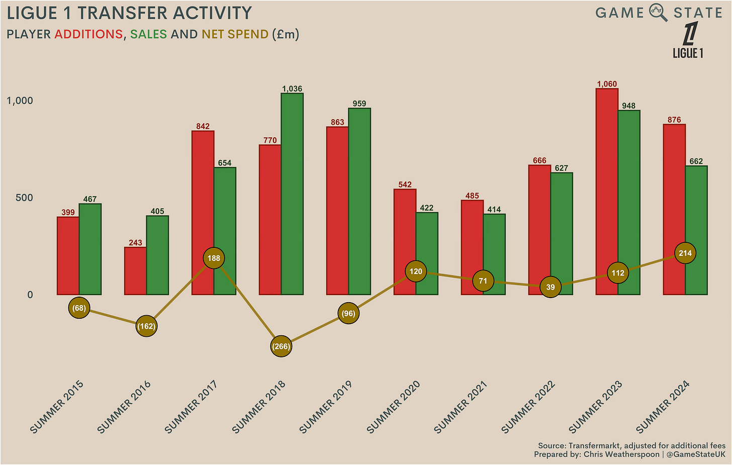 Despite the well-documented financial troubles currently plaguing French football, Ligue 1 clubs actually saw net spend on transfers double this summer, rising to over €200 million. In truth, league-wide views of the French top tier have been skewed ever since PSG’s takeover in 2011; their largesse is wildly out of step with the rest of the division, and
