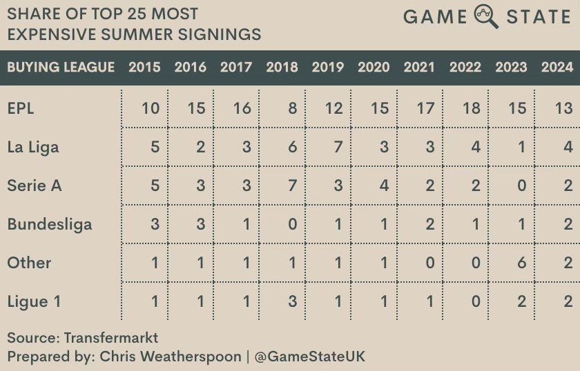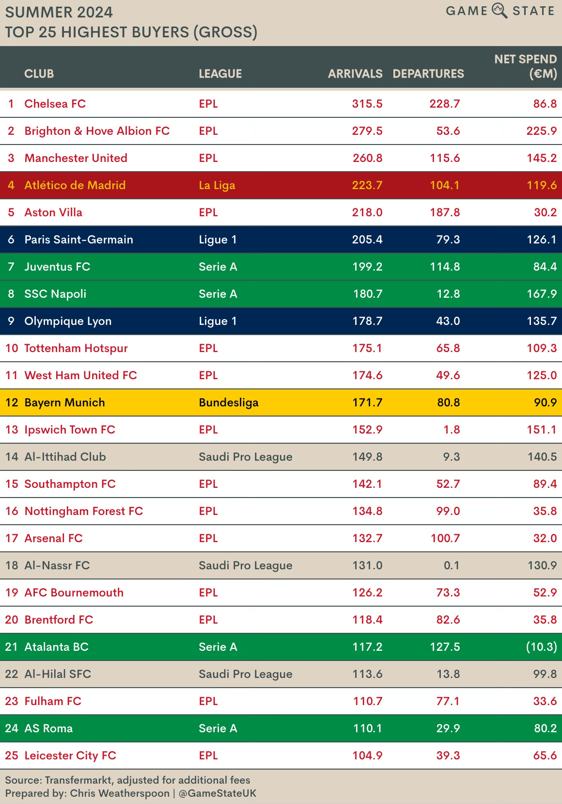 Correspondingly, on a club-by-club basis, EPL sides dominated the top 25 highest spenders on new players. No fewer than 14 English clubs appear in that top 25, with the EPL occupying the top three spots.