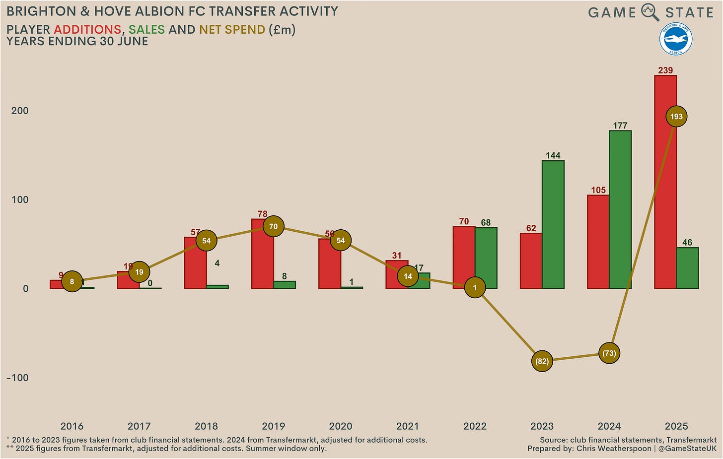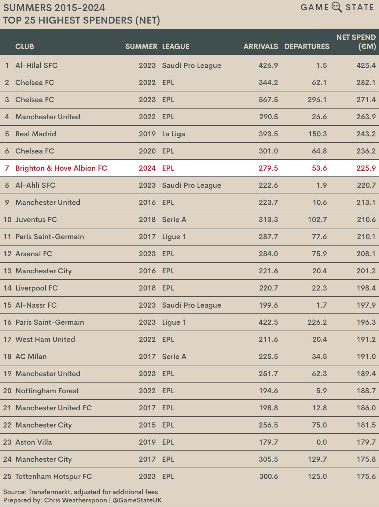 One of the beneficiaries of Leeds’ failed promotion bid were Brighton & Hove Albion, who parted with over €46 million for 22-year-old forward Georginio Rutter. In doing so they helped propel themselves to the top of this summer’s net spend table; Brighton’s net purchases of €226 million were a fair way ahead of second-placed Napoli (€168 million).