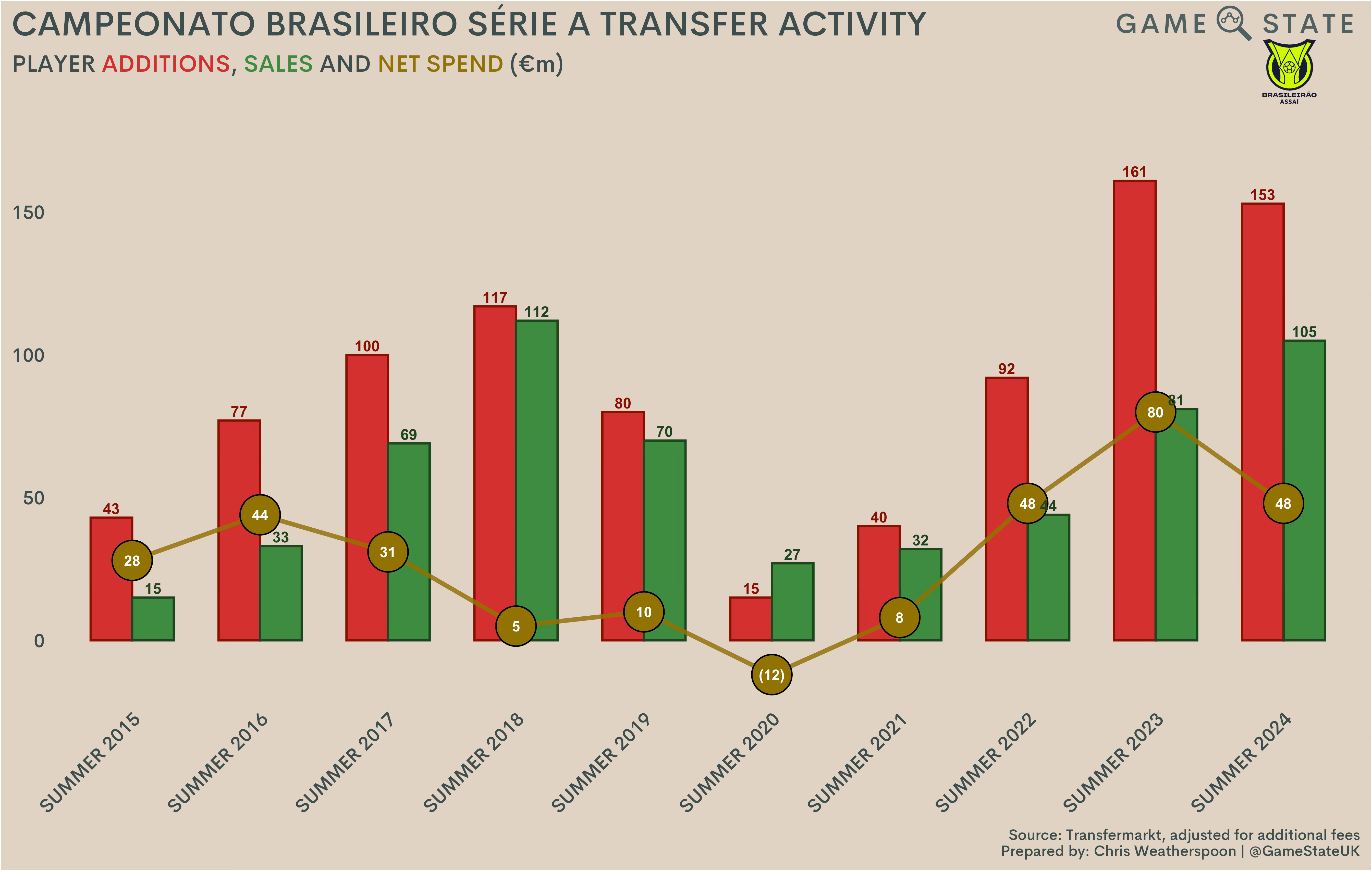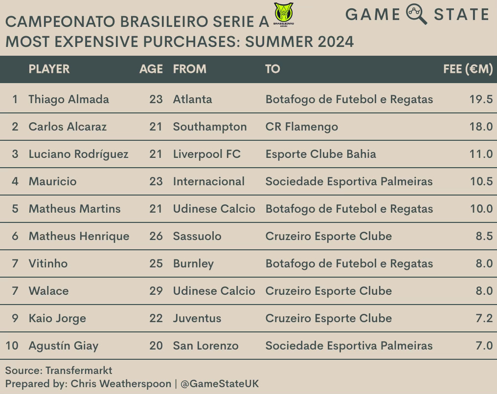 Outside of the Saudi Pro League, the only other non-European league in the top 10 spenders this summer was Brazil’s top tier. Following the relaxation, in 2021, of rules around private entities owning football clubs, swathes of money have entered Brazilian football. That, combined with the continued flow of young starlets to major European leagues, has ensured Brazilian clubs have pockets deep enough to collectively spend more than ever on transfers.
