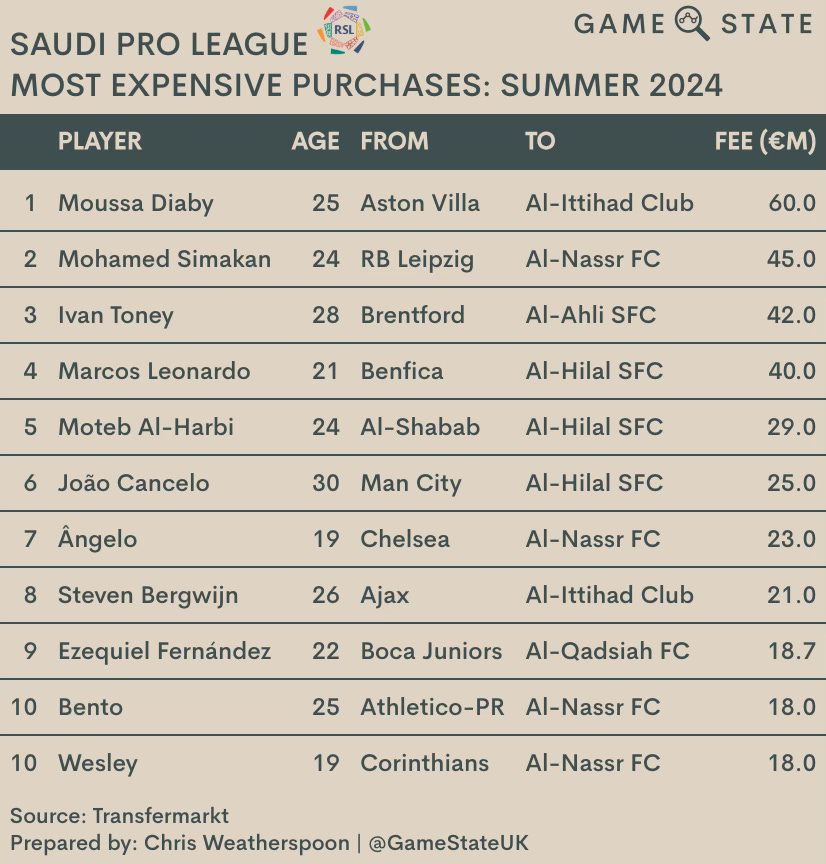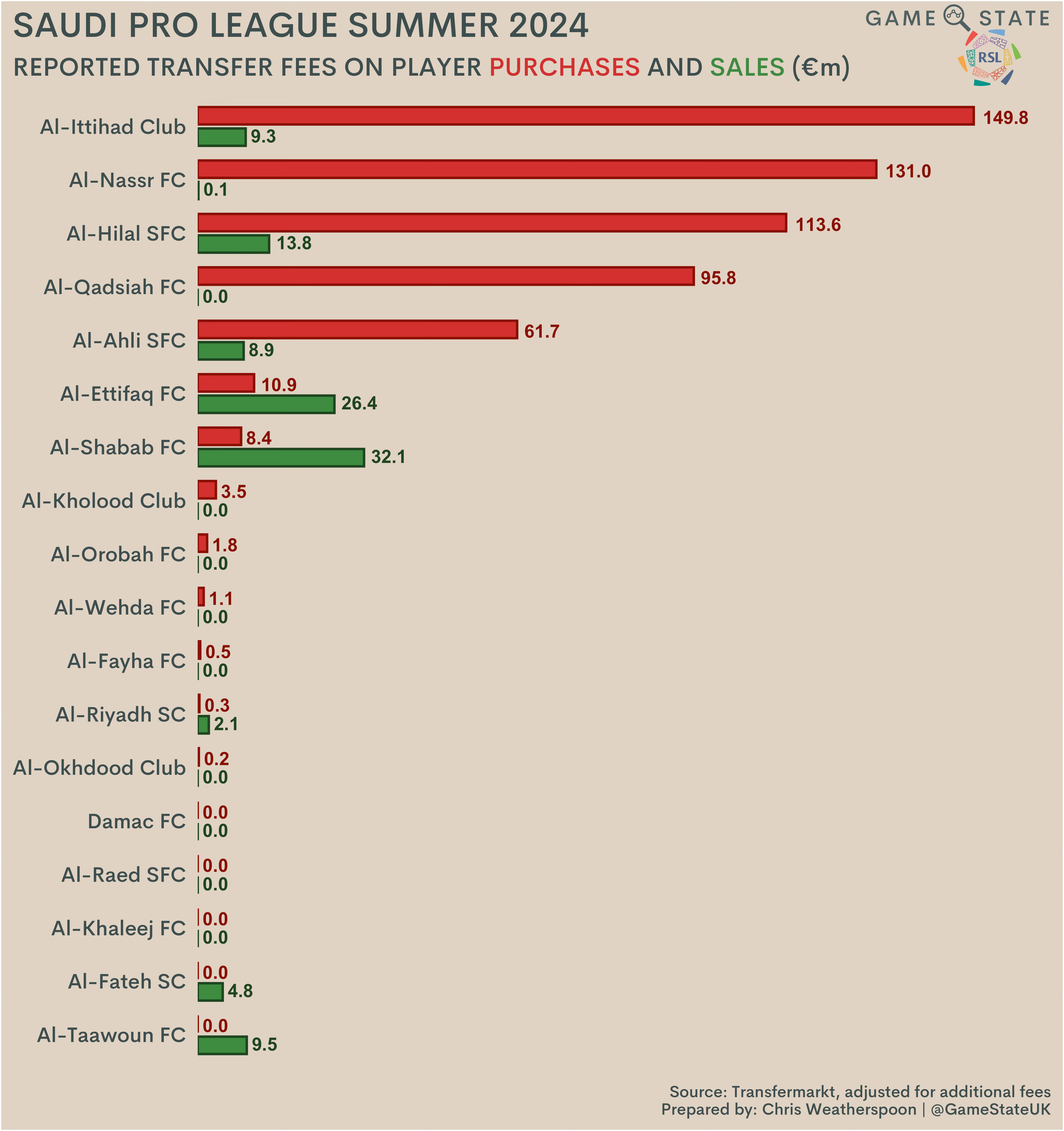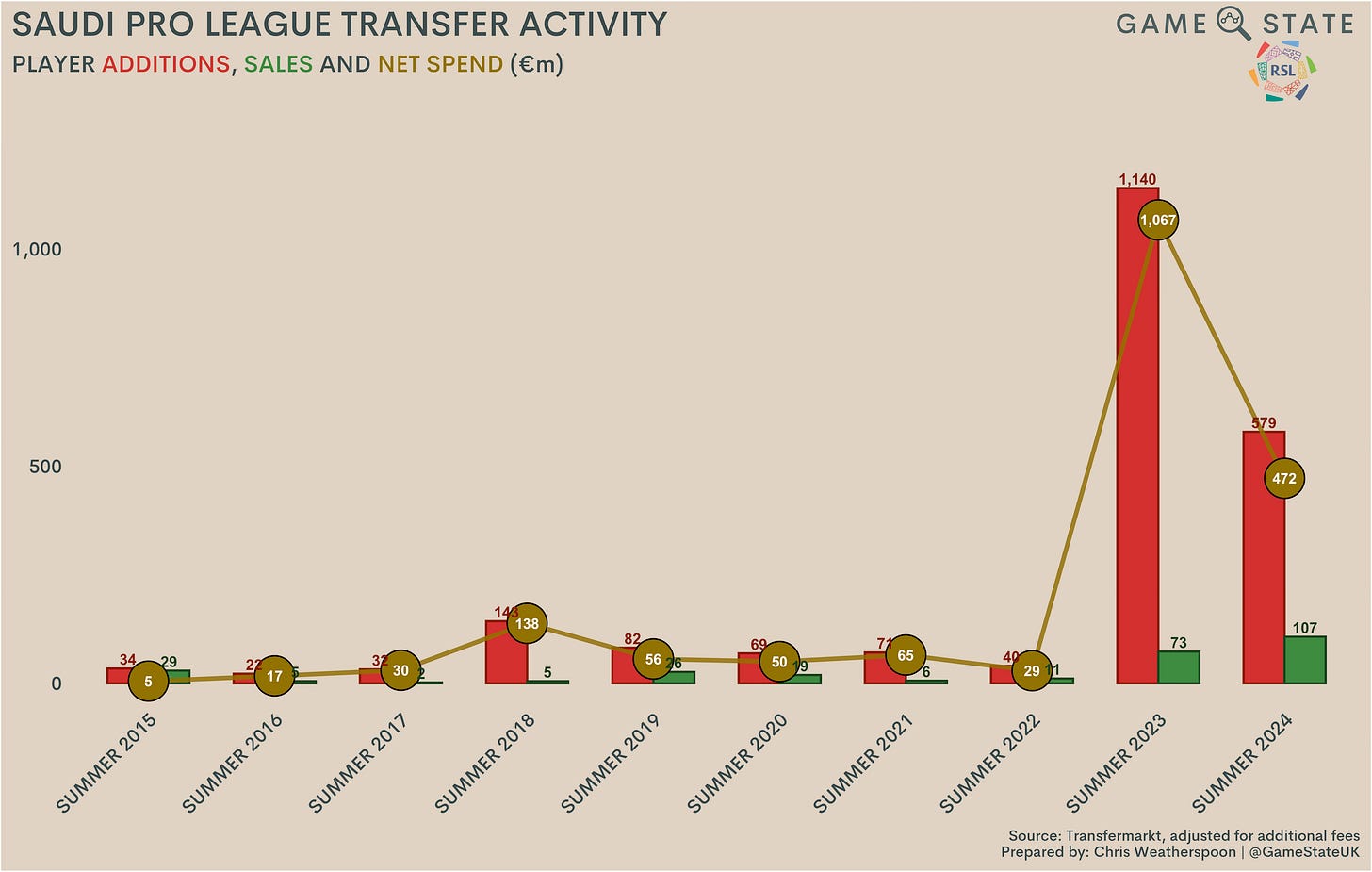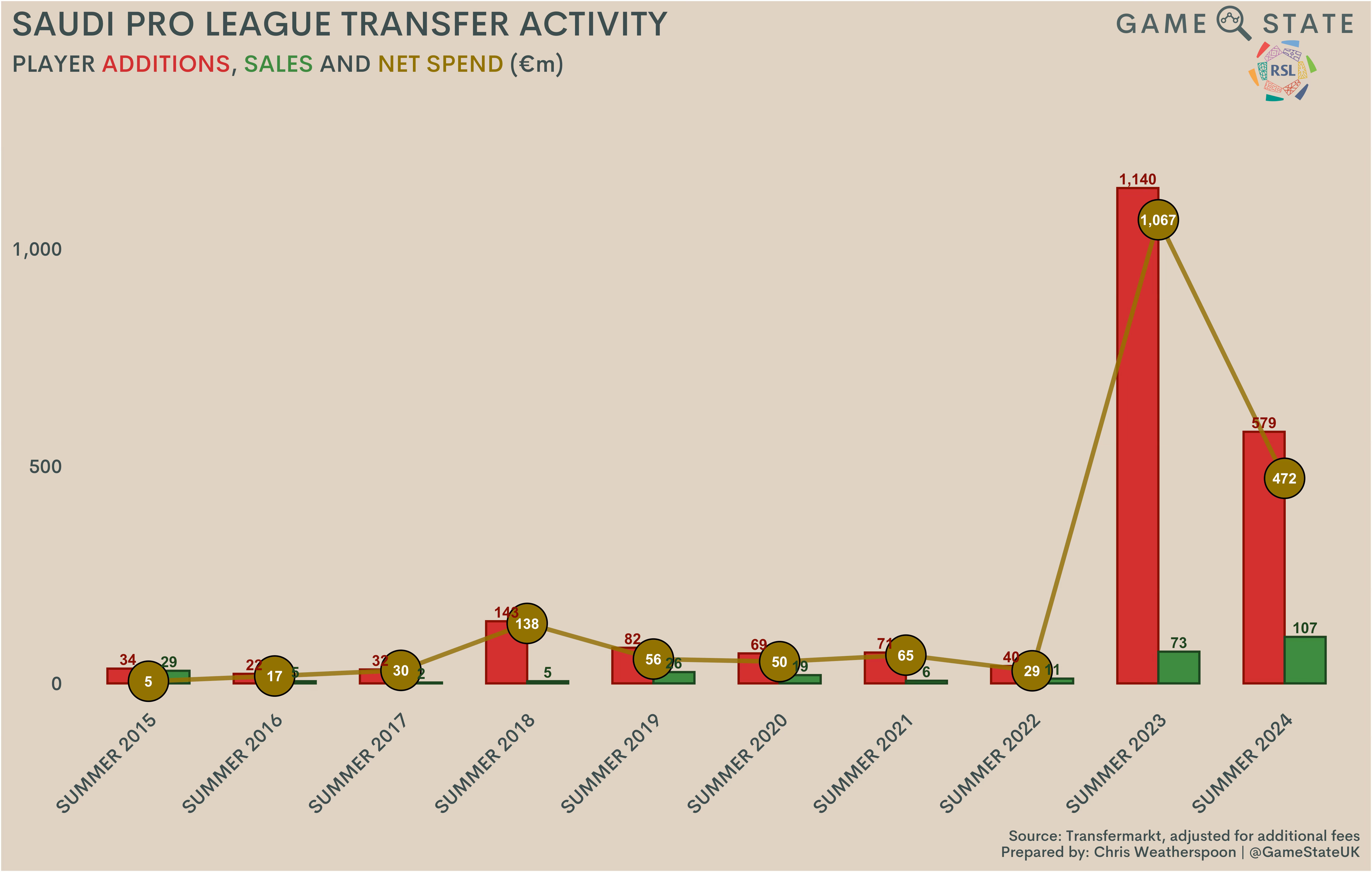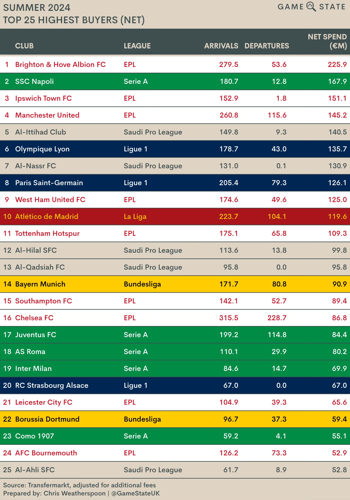 On a net basis, that €280 million sits as the seventh-highest in summer window history, albeit a long way behind the €427 million Al-Hilal spent on bringing Neymar, Malcom, Rúben Neves and Aleksander Mitrović, to name just four, to the Saudi Pro League in 2023.