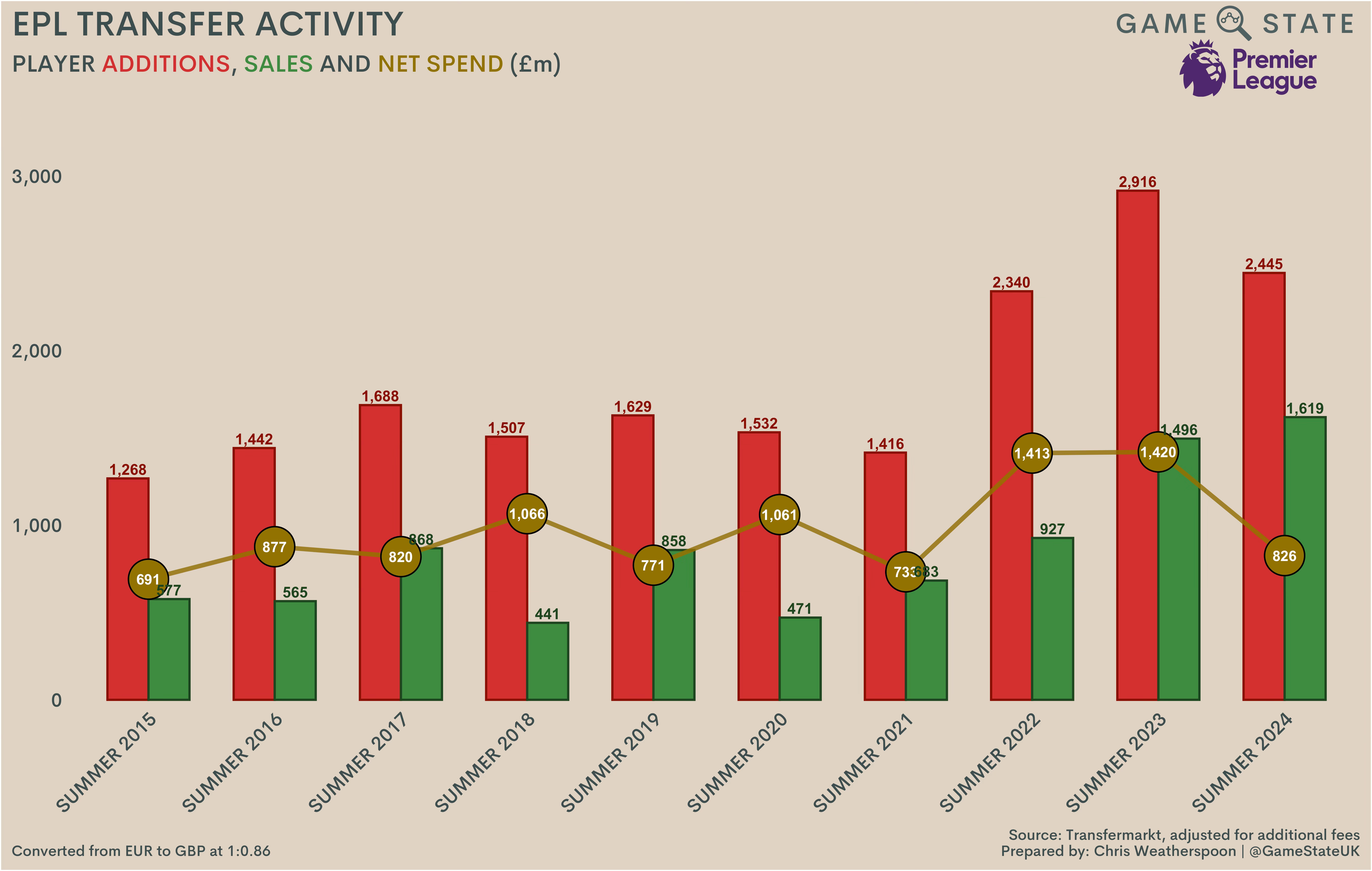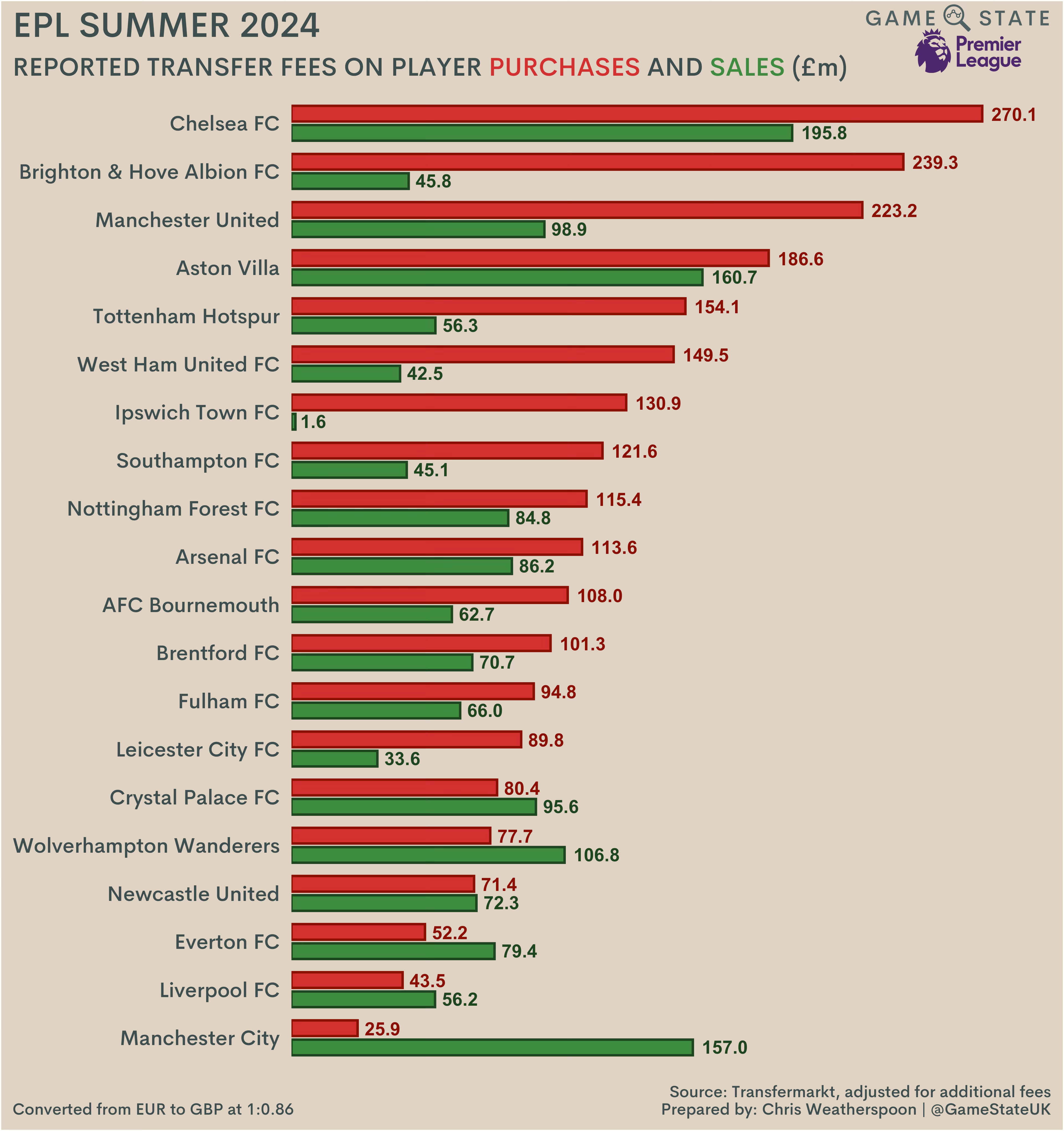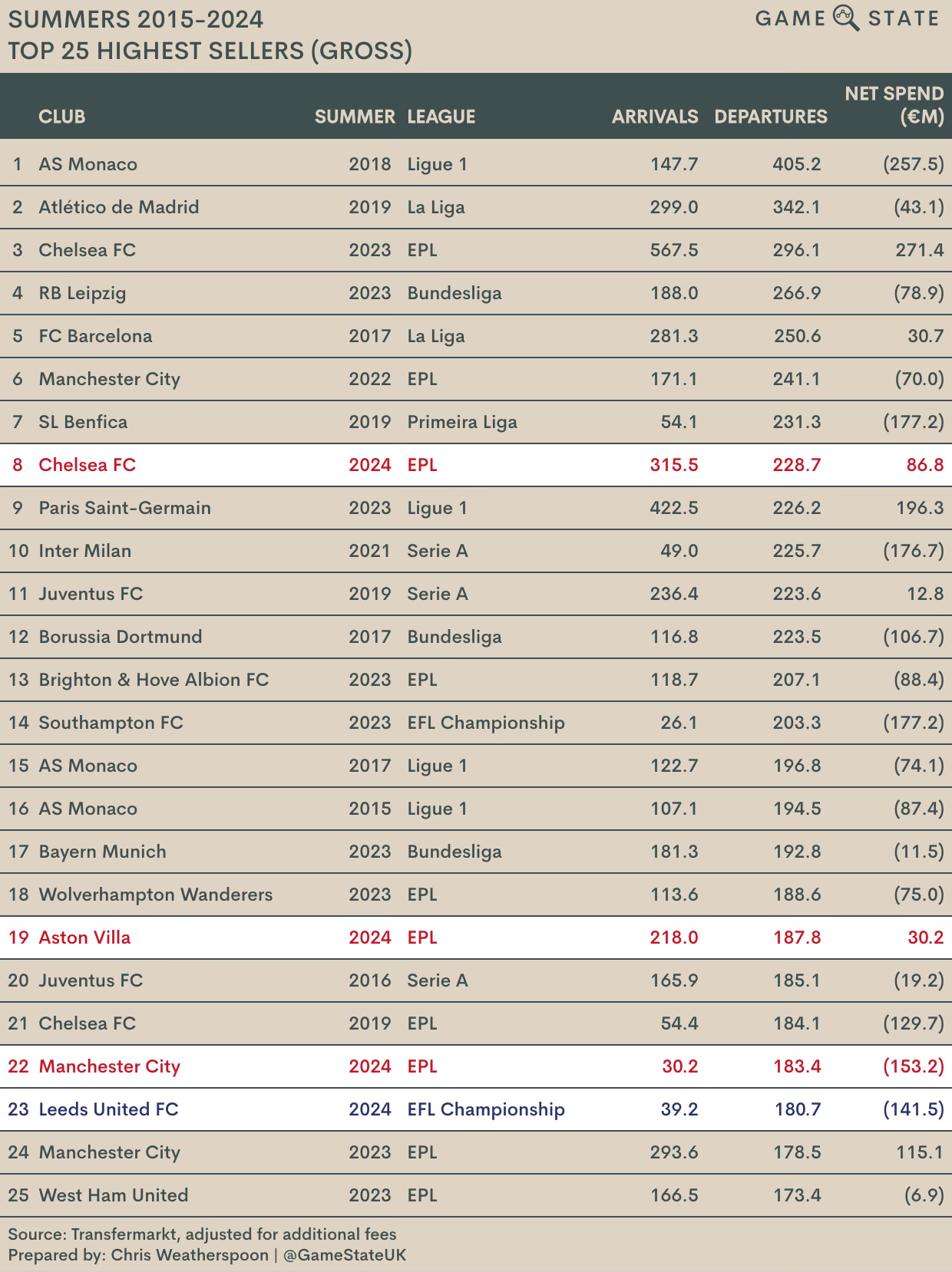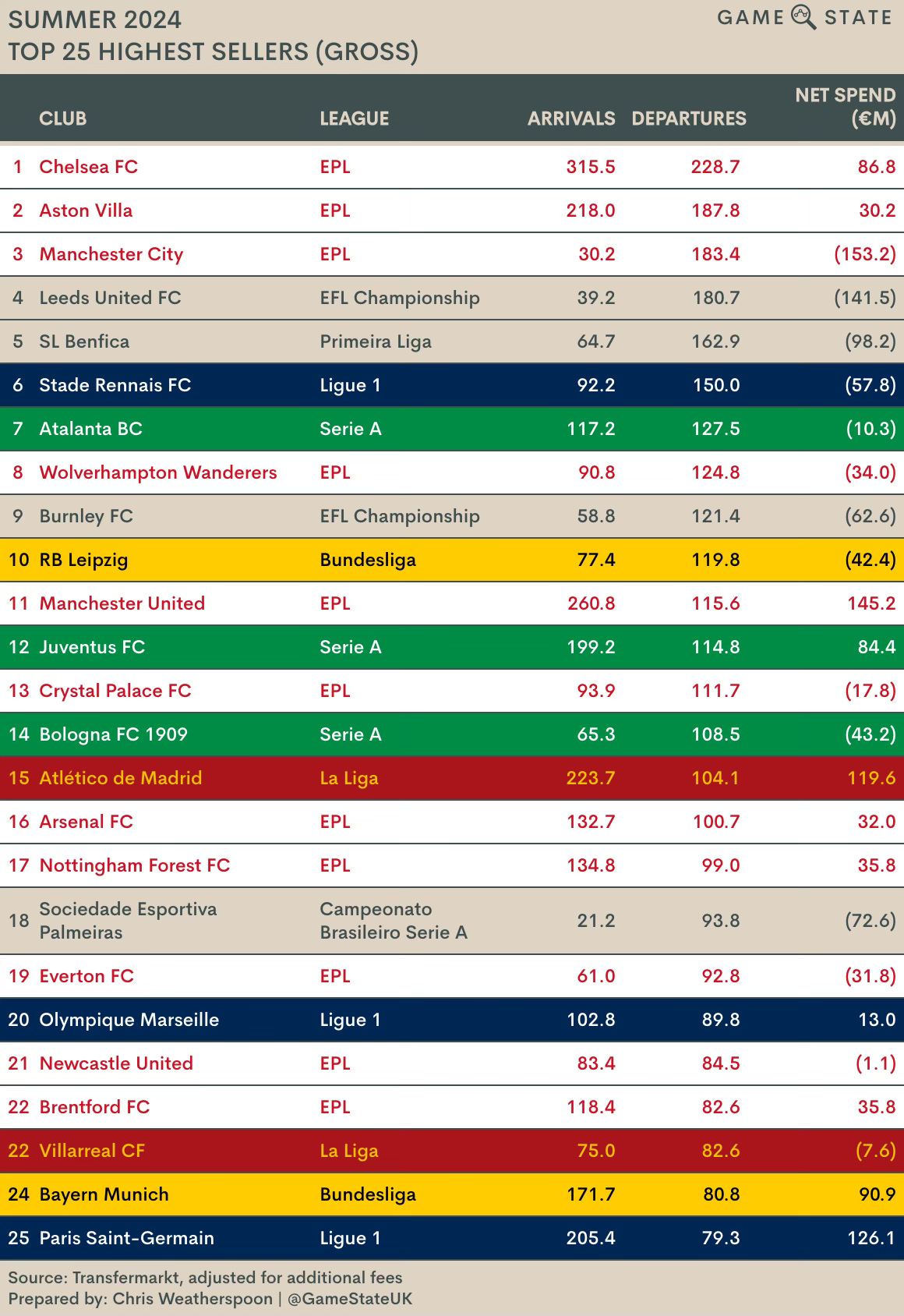 In fact, were it not for PSR, the EPL’s gross spend would have fallen even further. The end of June saw a spate of ostensibly separate deals made between the same parties, whereby clubs in need of a boost to their bottom line ensured they recouped chunky fees for sold players rather than simply engaging in player swaps. At least six different clubs - Chelsea, Aston Villa, Nottingham Forest, Newcastle United and Everton - engaged in such deals before June was out.