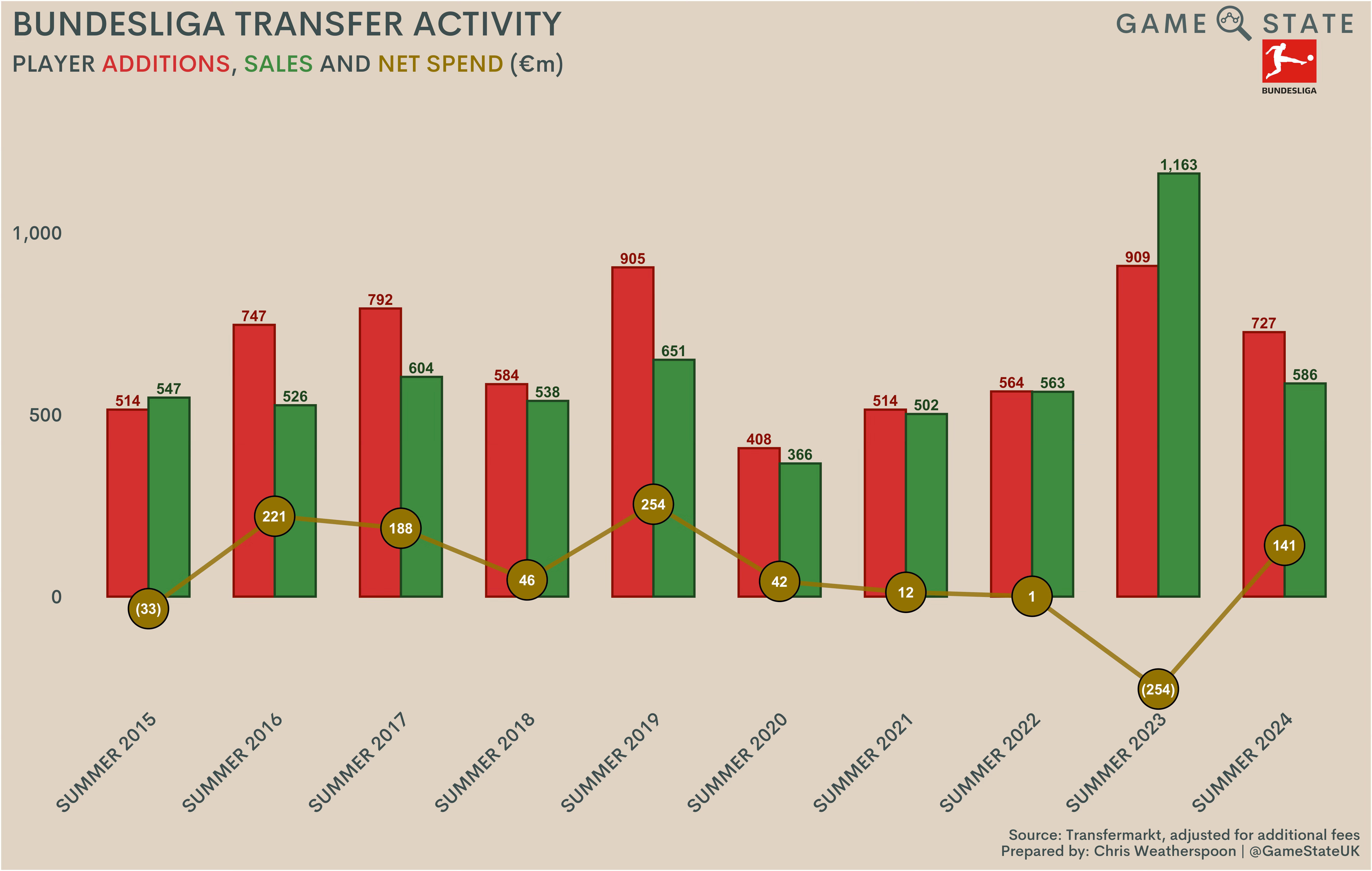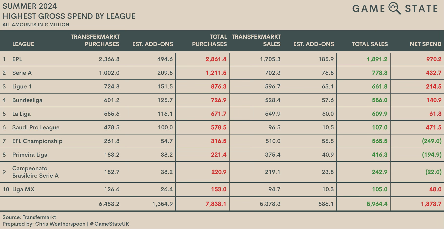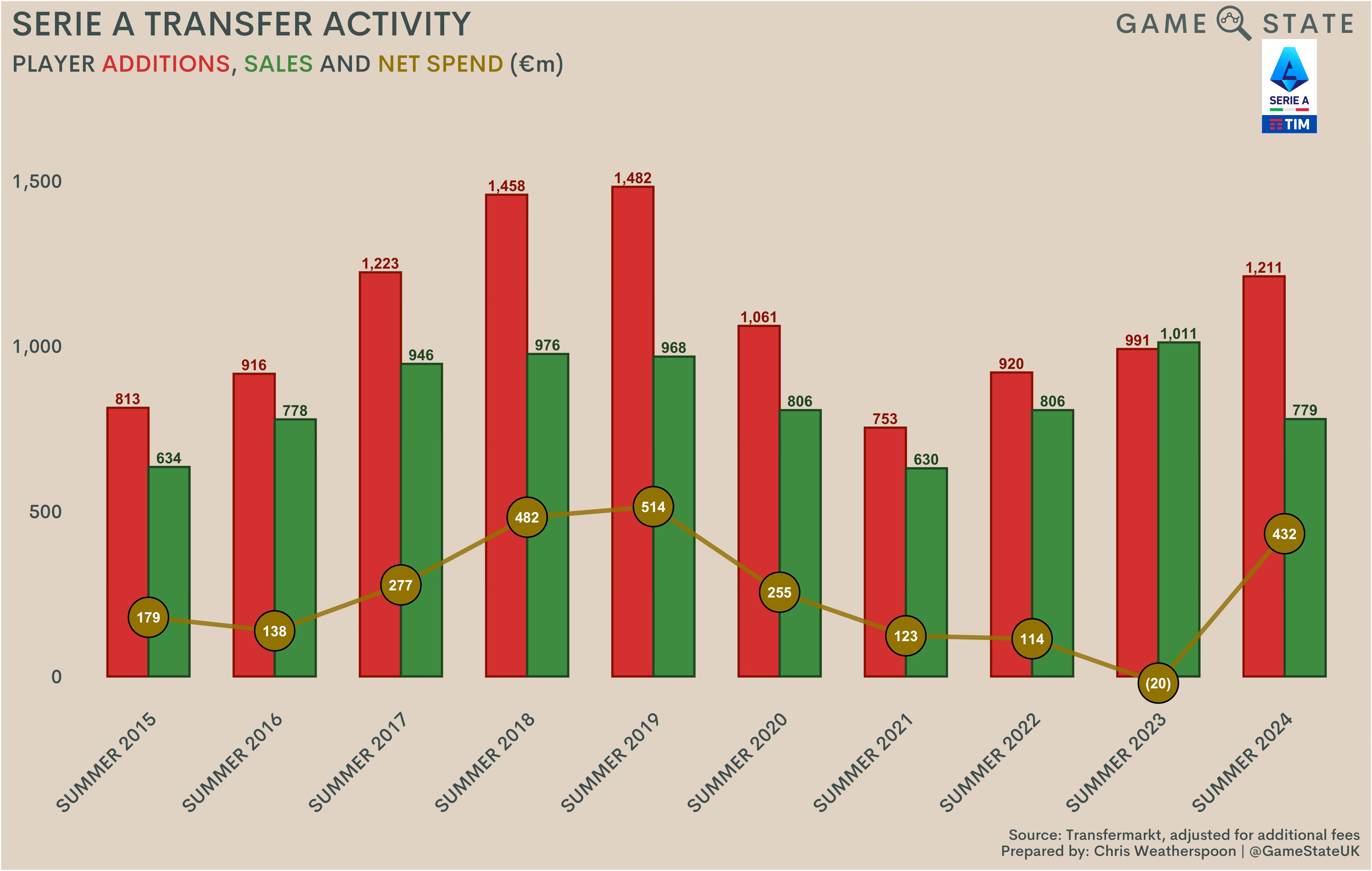 Serie A booked a rare instance of net income on player trading in 2023, but bounced back considerably this summer, clearing €1 billion in gross spending for the first time in four years. Despite a domestic TV deal that has actually fallen slightly, several Italian clubs showed little sign of worrying about any impending credit crunch.