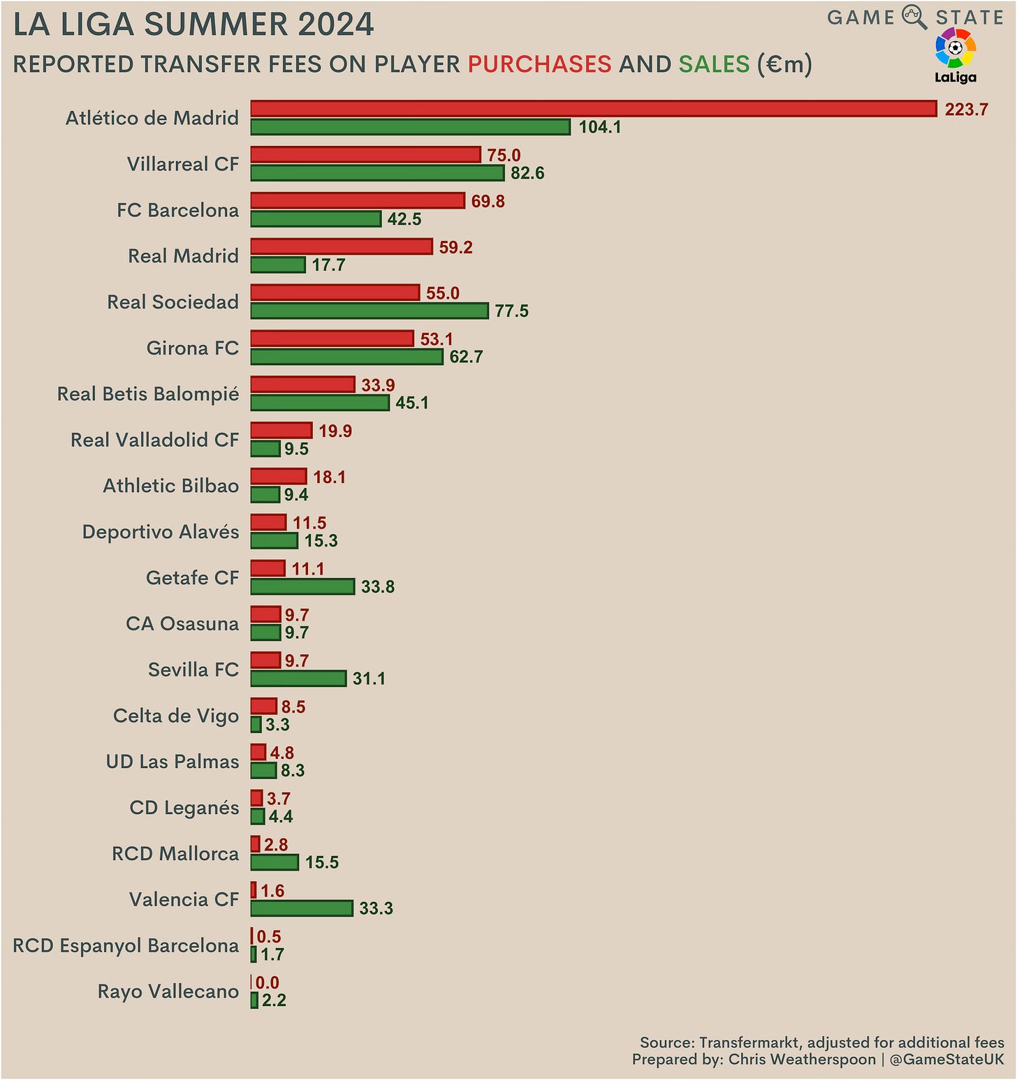 In fact, Atléti weren’t even joined at the top of the spending table by their usual allies. FC Barcelona and Real Madrid were bumped down the order a spot, as Villarreal spent €75 million on bringing six new players to the Estadio de la Cerámica. Logan Costa, Thierno Barry, Luiz Júnior and Willy Kambwala all arrived for fees in excess of €10 million.