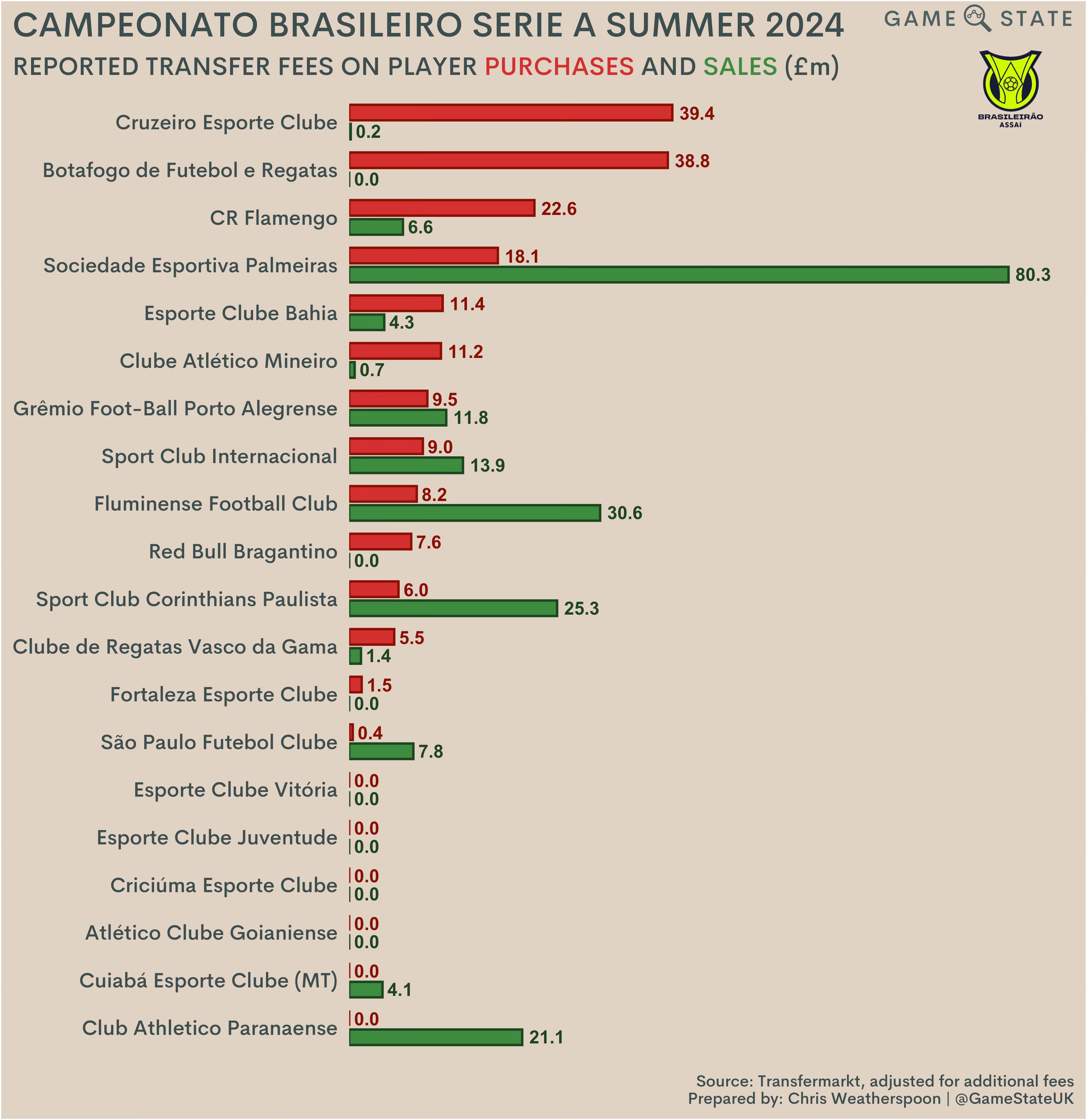 Eight of 20 clubs remained net sellers this summer, but the uptick in spending is clear to see. What is more, there are signs of a prominent trend reversing. Where young Brazilians have, for a long while now, flocked to European shores, this summer presented evidence of Série A clubs wresting a number of young players from their transatlantic counterparts. Granted, the likes of Endrick still took their leave of Brazil, but a rung or two down on the quality ladder saw a number of players traverse the opposite route.