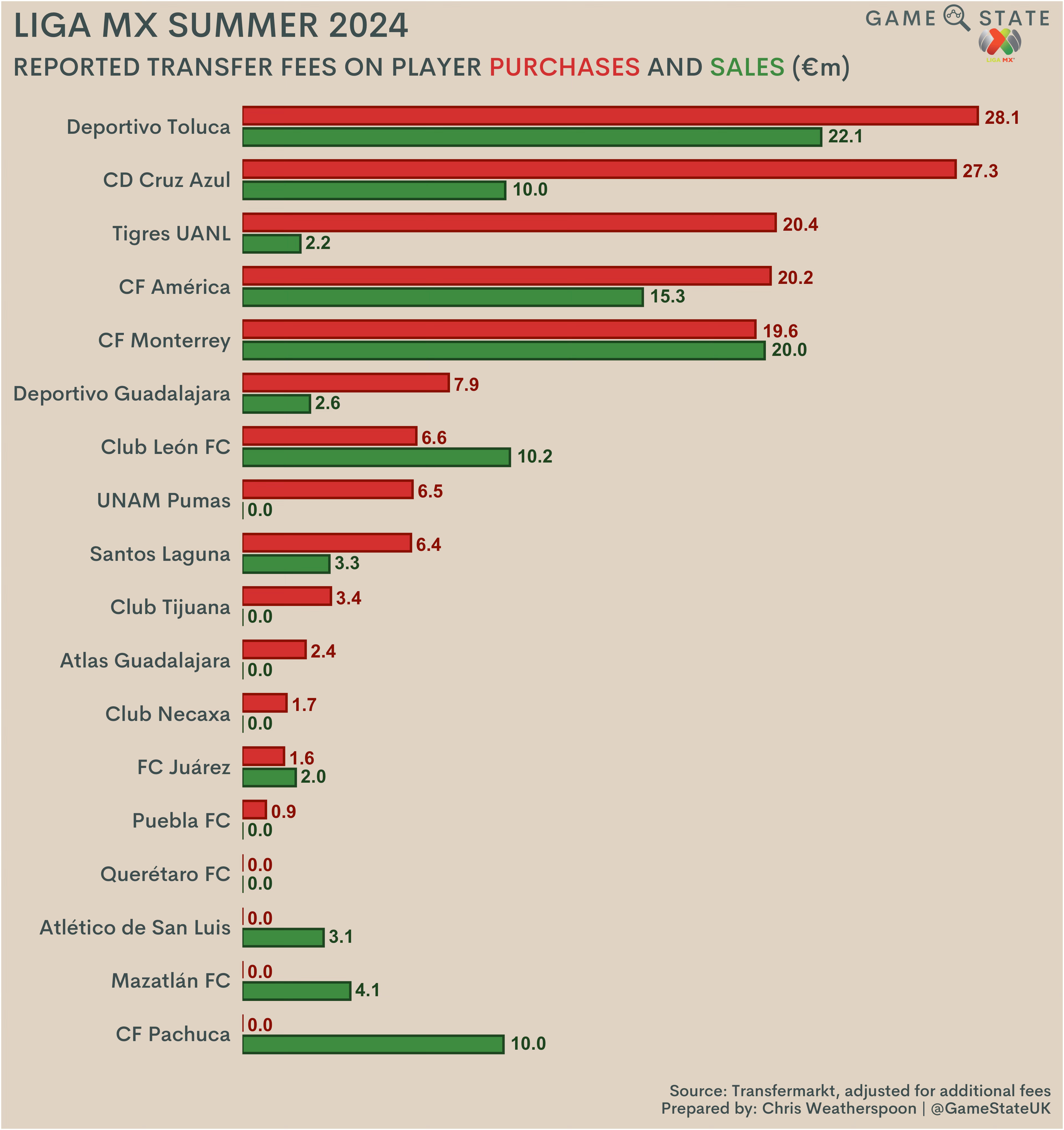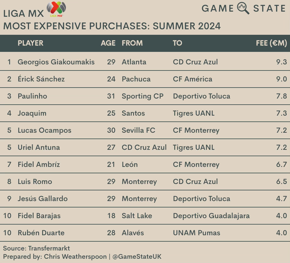 *Note: the Mexican transfer window doesn’t close until Saturday 14 September. Figures used here are correct to the end of Monday 9 September.