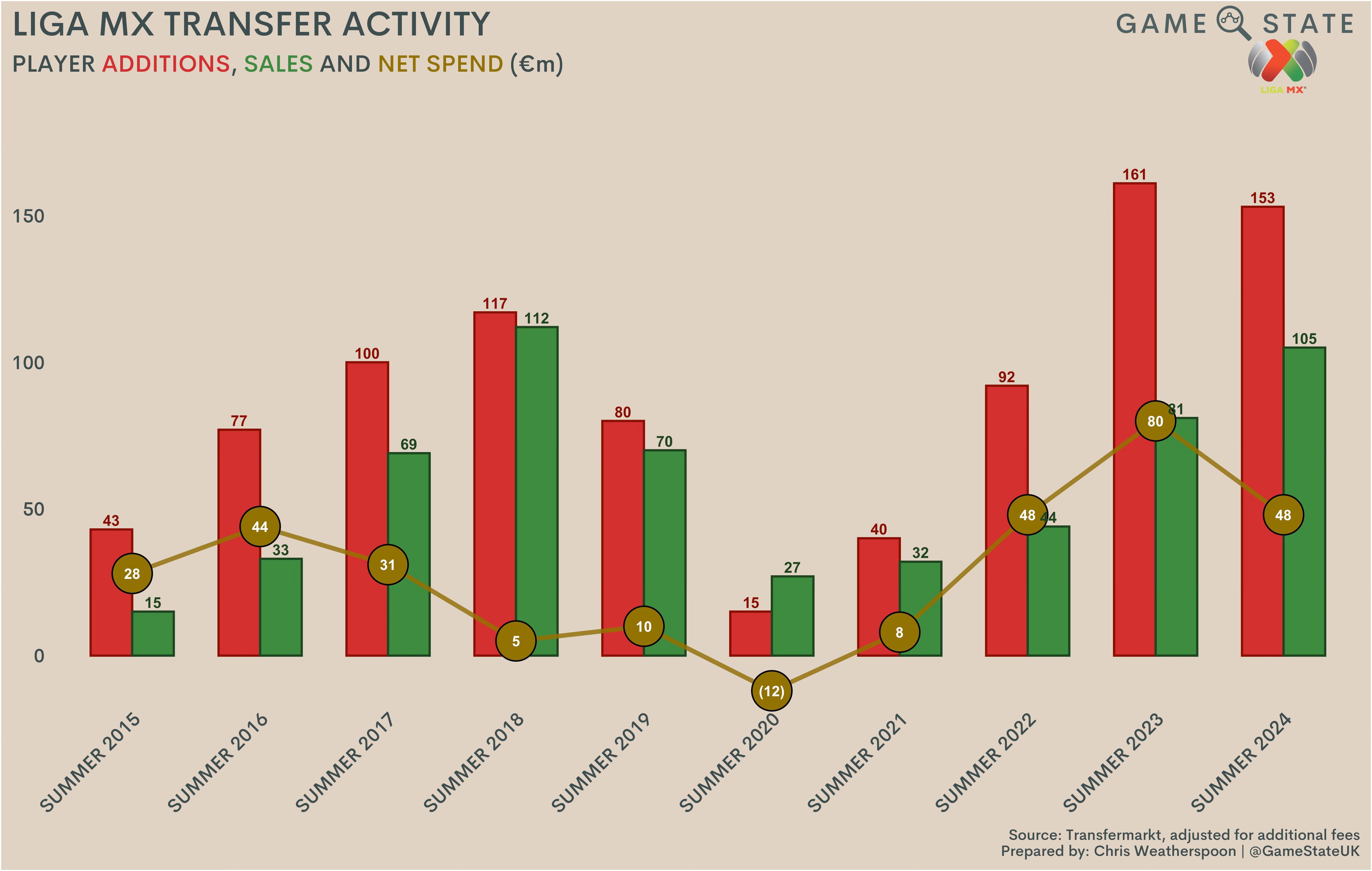 At the time of writing the higher spenders, by a smidge, were the clubs of the Mexican first division, even despite the league’s net spend almost halving from summer 2023.