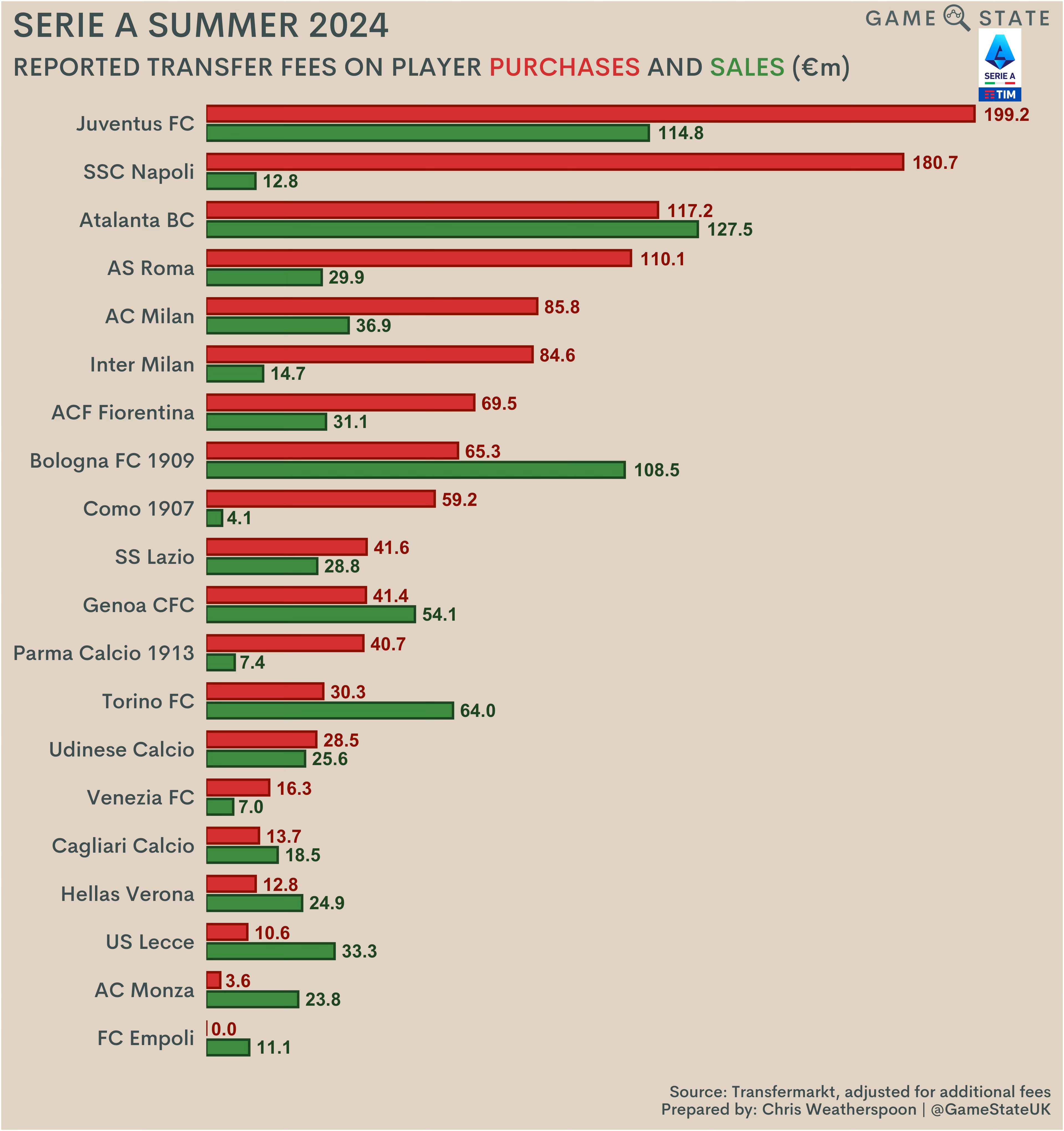 Unlike the EPL, where even the lowest spenders (gross) parted with an eight-figure sum, the bottom end of Serie A saw a contrast to the top. At FC Empoli not a penny was spent on new players, even after the club survived relegation last season by just a single point. Having said that, perhaps consistency will prove key: only three games have been played, but at the moment Empoli sit seventh and unbeaten.