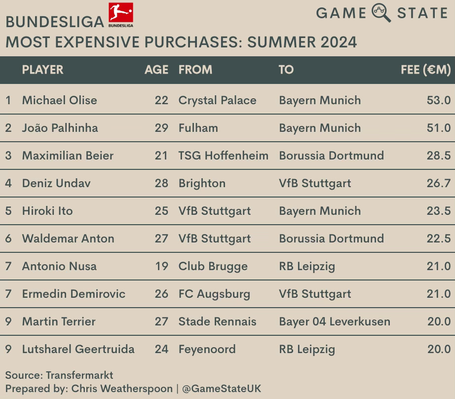 While the summer’s two largest deals saw star players in English sides move to Bavaria, four of the 10 biggest were transactions that stayed within the confines of the Bundesliga. Dortmund nabbed 21-year-old striker Maximilian Beier for a shade under €30 million from TSG Hoffenheim following a breakout season last year, while VfB Stuttgart found themselves raided by both of the league’s biggest names for their centre-back pairing of Hiroki Ito (Bayern) and Waldemar Anton (Dortmund).
