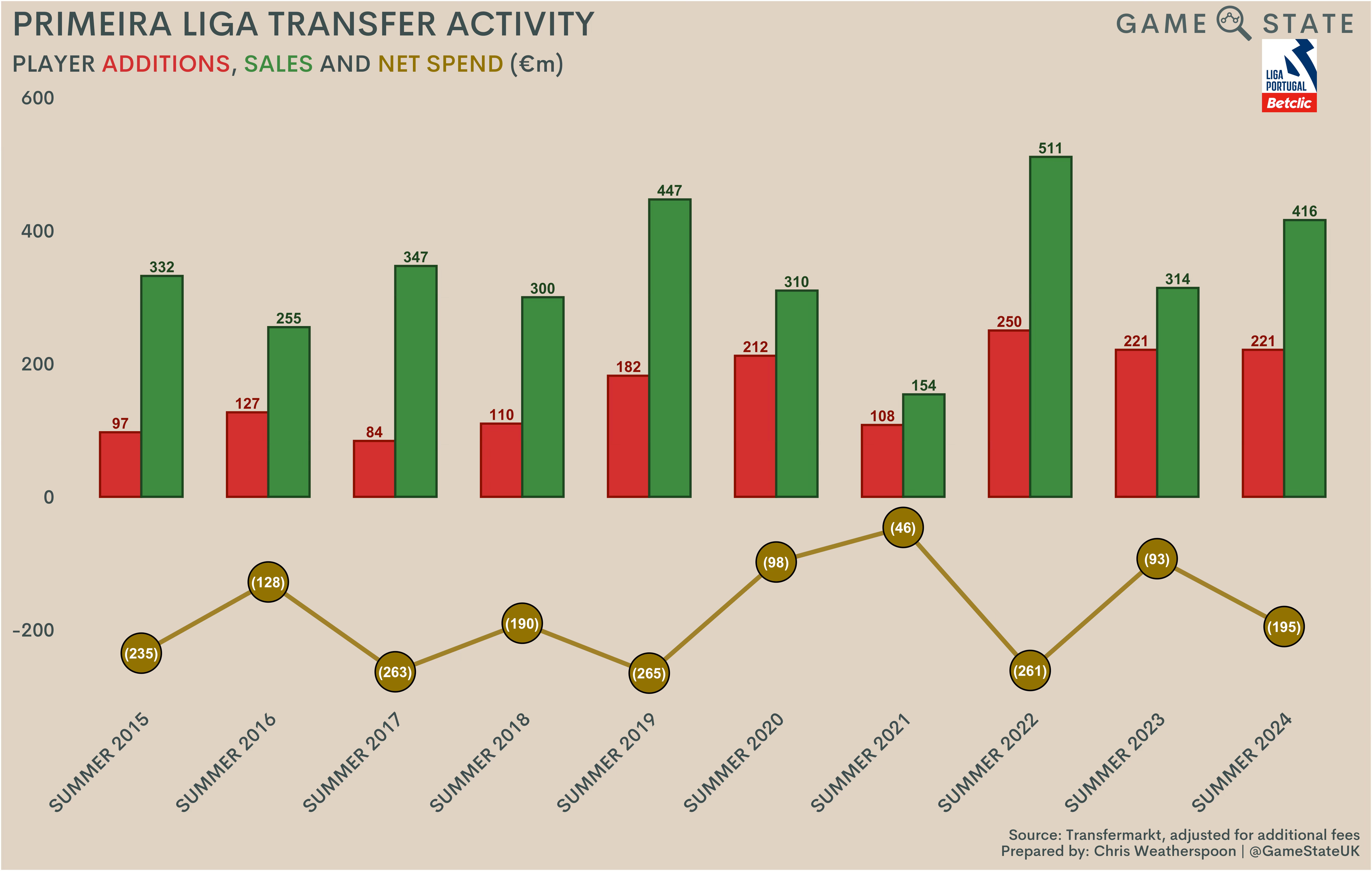 In Portugal, the Primeira Liga retained its reputation as one of the best selling divisions in world football. Every summer for the last decade has seen Portuguese clubs generate net income from transfers, and only during the Covid-induced slowdown in 2021 did that net income dip below €100 million.