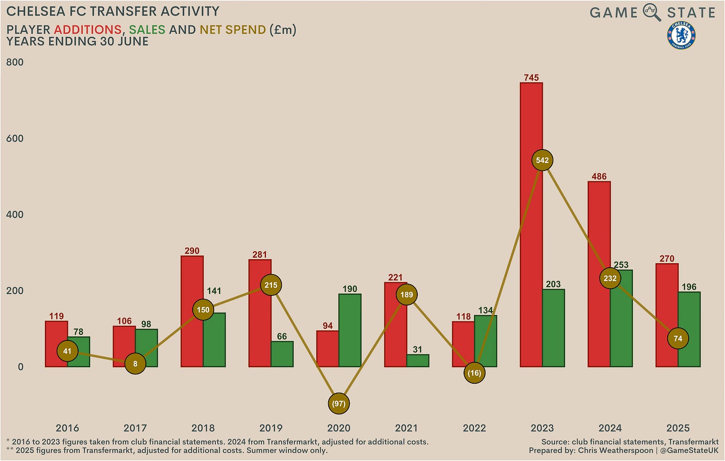 Chelsea now boast three of the top seven most frivolous transfer summers in football history, each of those coming in the last three years. Across those three windows the club has brought in 36 new players, 33 of them for fees, with 27 arriving for fees in excess of €10 million.