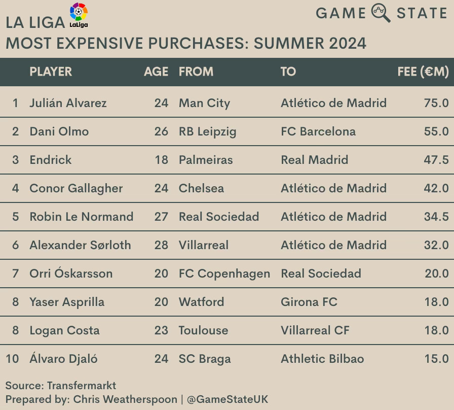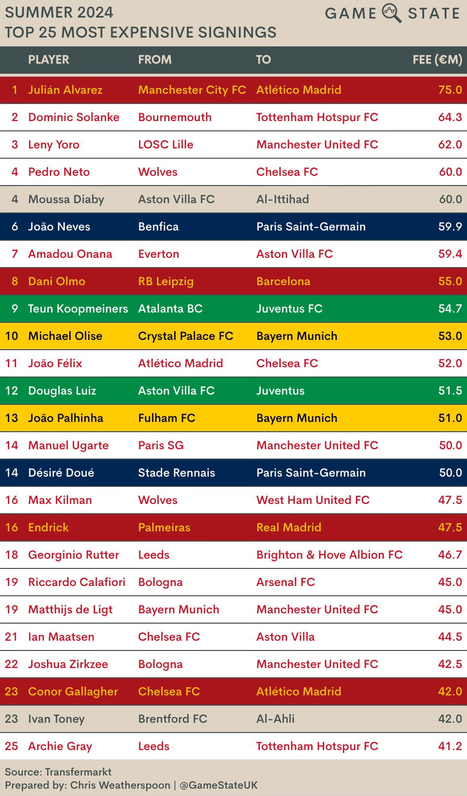 La Liga clubs paid four of the largest fees in 2024, though it’s notable these were spread across the three clubs that outstrip the rest of the division in spending. Atlético sent another €42 million to England in exchange for the services of Conor Gallagher, while FC Barcelona and Real Madrid got in on the act too, signing Dani Olmo (€55 million) and the hot Brazilian prospect Endrick (€47.5 million) from RB Leipzig and Palmeiras respectively.