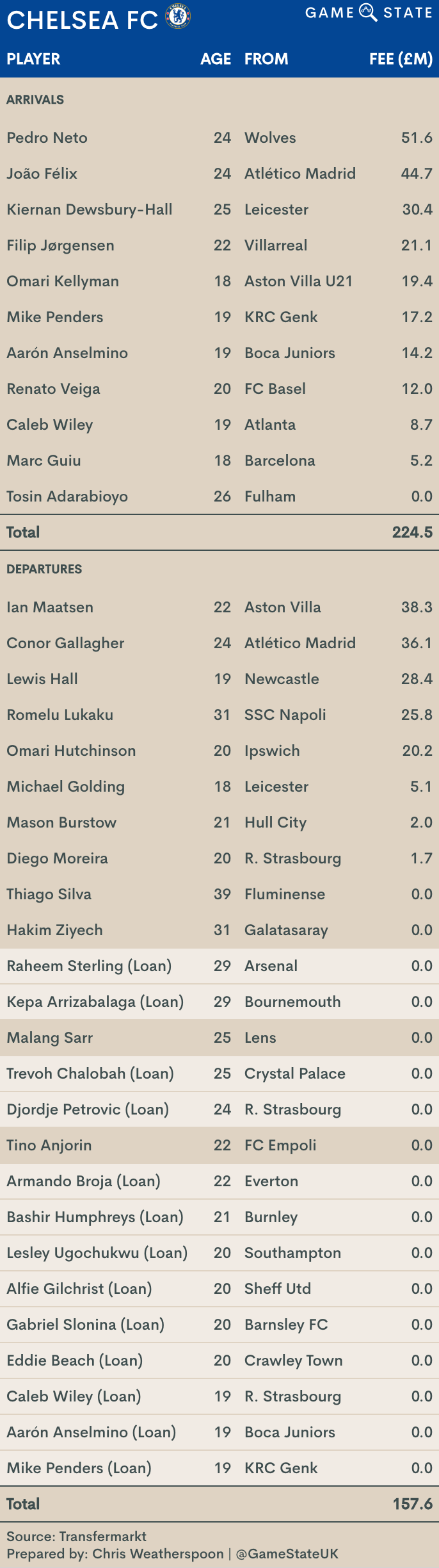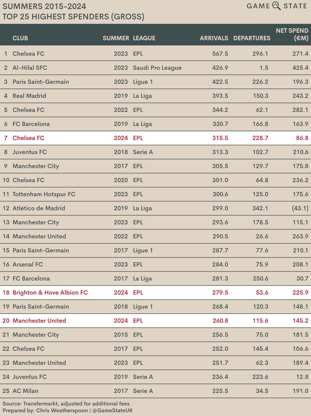 The highest spending club on a gross basis this summer was precisely the same club that topped the same list in each of the past two summer windows: Chelsea. Far from the departure of Russian oligarch Roman Abramovich ushering in an era of frugality, the Stamford Bridge outfit’s spending has been turbocharged since their takeover by majority owners Clearlake Capital in May 2022.