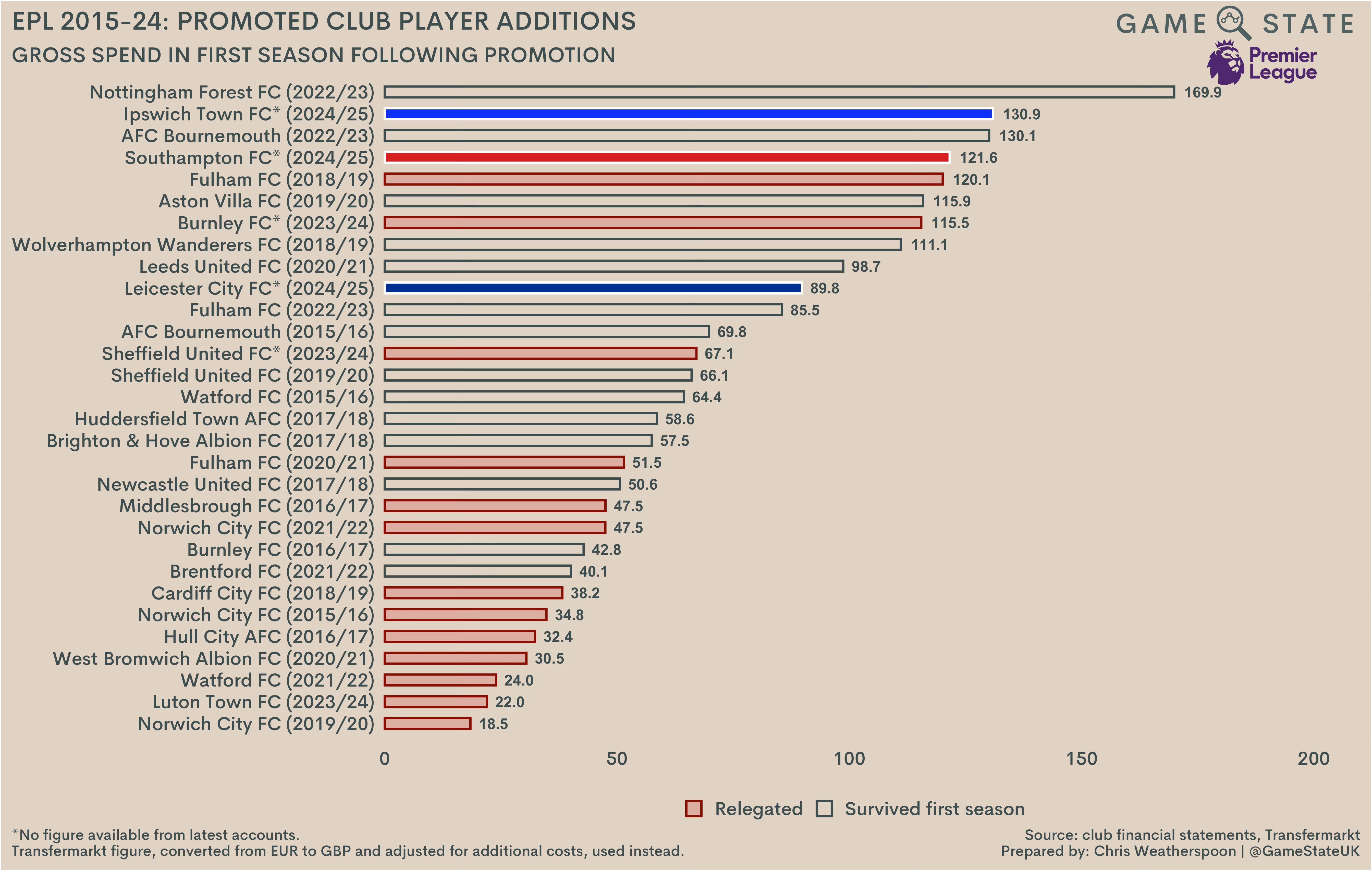 Yet even set against promoted clubs in the last 10 years, Ipswich stand out. Their estimated £131 million spend on new players is the second-highest of any promoted club, and pits them among just seven other EPL newbies to spend over £100 million immediately after coming up (Southampton, who were promoted via the play-offs in May, also form part of this group).