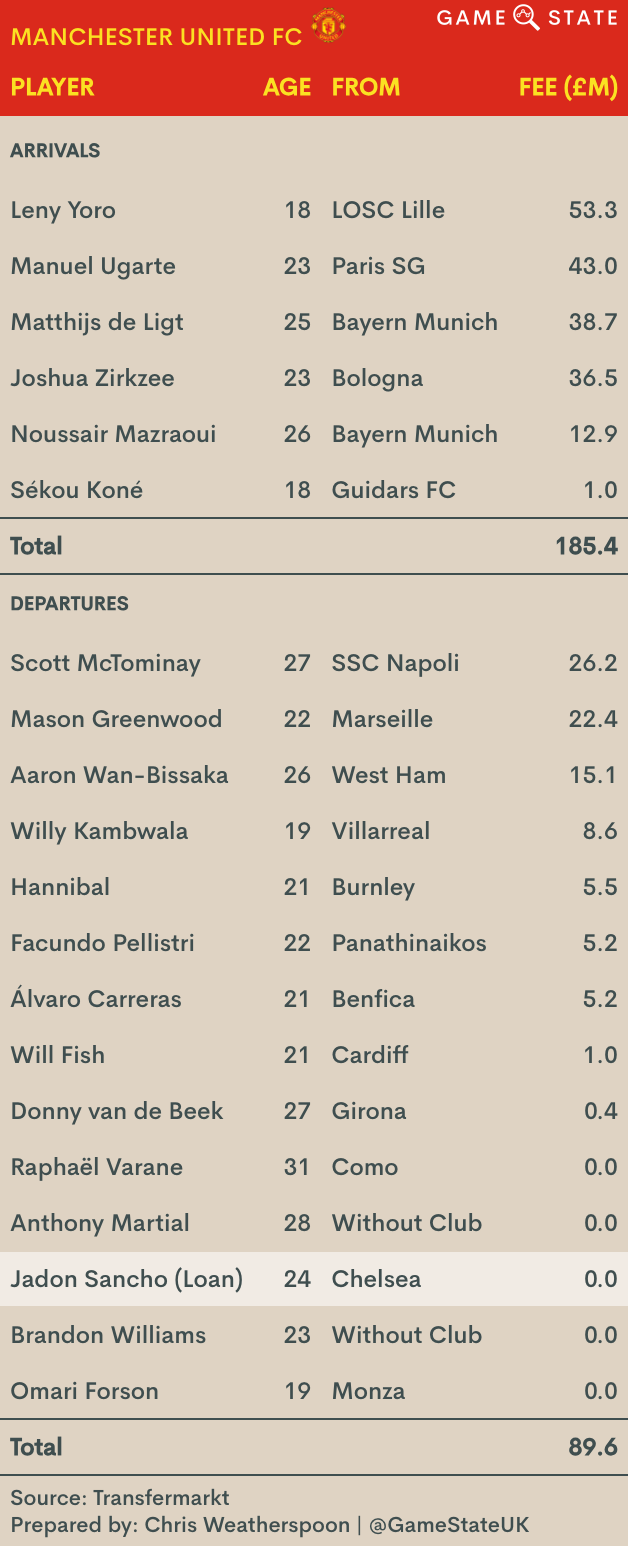 City’s net income this summer was £131 million, as the club only spent a fee on signing winger Savinho from fellow City Football Group club, ES Troyes. Julian Alvarez’s departure to Atlético Madrid was the summer’s biggest deal worldwide, but City also recouped chunky fees on the sales of João Cancelo (sold to Al-Hilal), Taylor Harwood-Bellis (Southampton), Liam Delap (Ipswich Town) and Sergio Gómez (Real Sociedad).