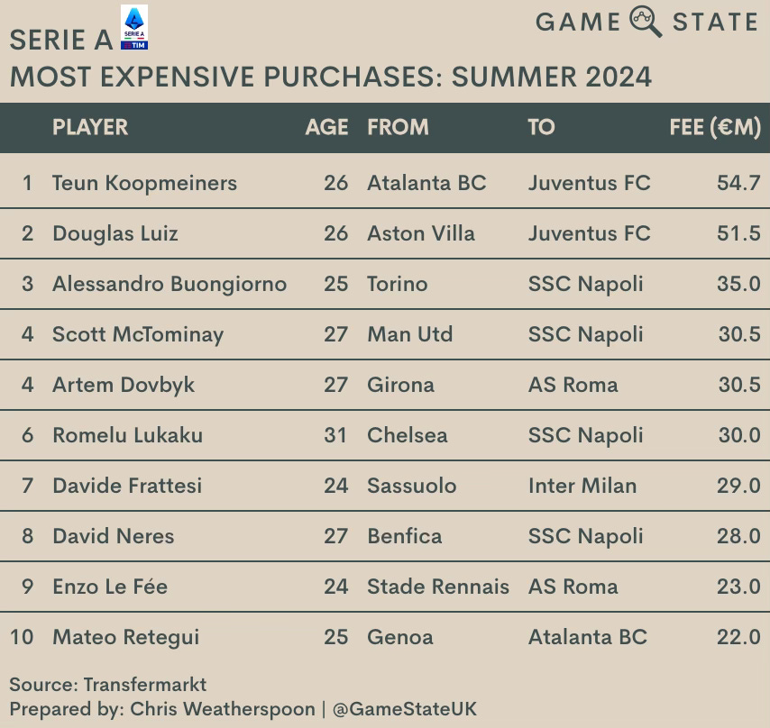 Juventus led the way both collectively and individually, their signings of Teun Koopmeiners and Douglas Luiz setting them back over €100 million of their €200 million outlay.