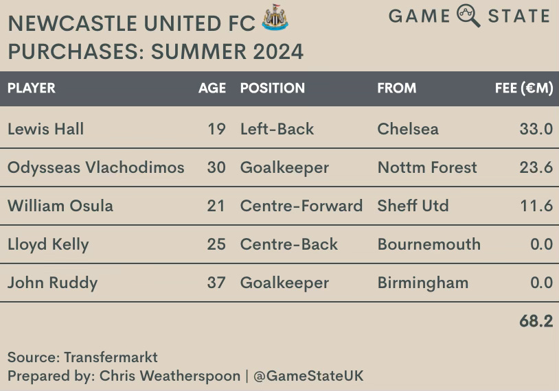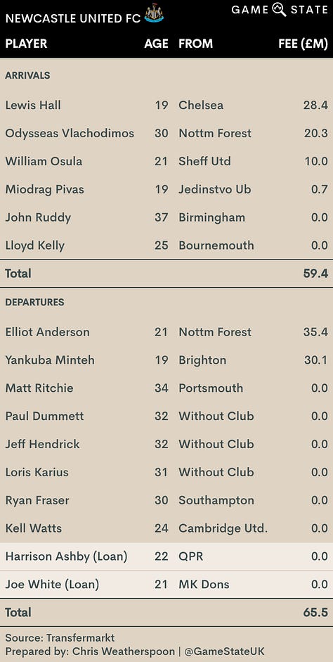 In the end, Newcastle signed just three players for fees, and one of those was the £20 million signing of Odysseas Vlachodimos from Nottingham Forest, in a swap-that-wasn’t-a-swap for academy graduate Elliot Anderson that helped the Magpies out of their PSR hole.