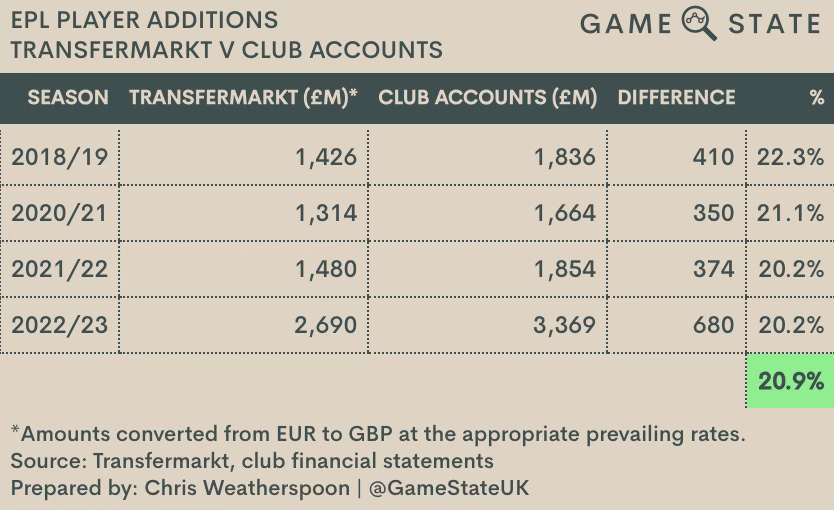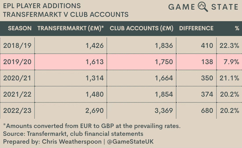 To that end, and to enable a projection of those additional ‘unreported’ costs of transfers, Game State has undertaken a comparison of Transfermarkt data and that per club accounts for EPL clubs over the last half-decade, spanning the 2018/19 season to 2022/23 (the last for which we have publicly available club financials).