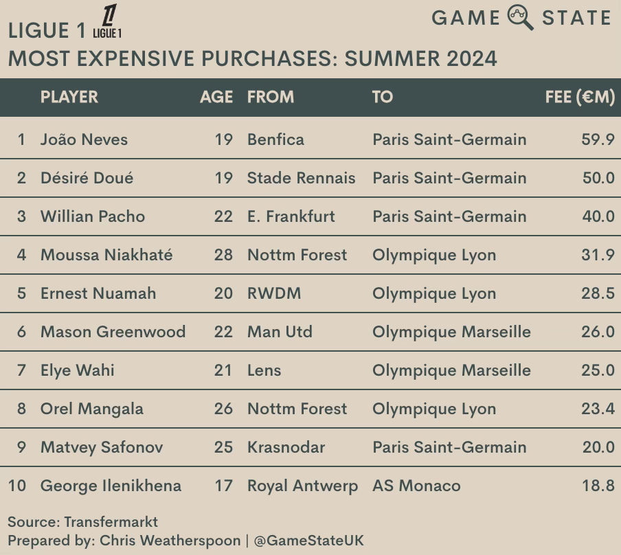 Vying with PSG were Olympique Lyon, who parted with the thick end of €180 million this summer, sending around €60 million of that to Nottingham Forest for the services of Moussa Niakhaté and Orel Mangala. Lyon enjoyed (or endured) a strange summer, spending heavily before, reportedly, putting the majority of the first-team squad up for sale in order to raise funds. That they were outsold by six other Ligue 1 clubs would suggest the tactic didn’t particularly work.