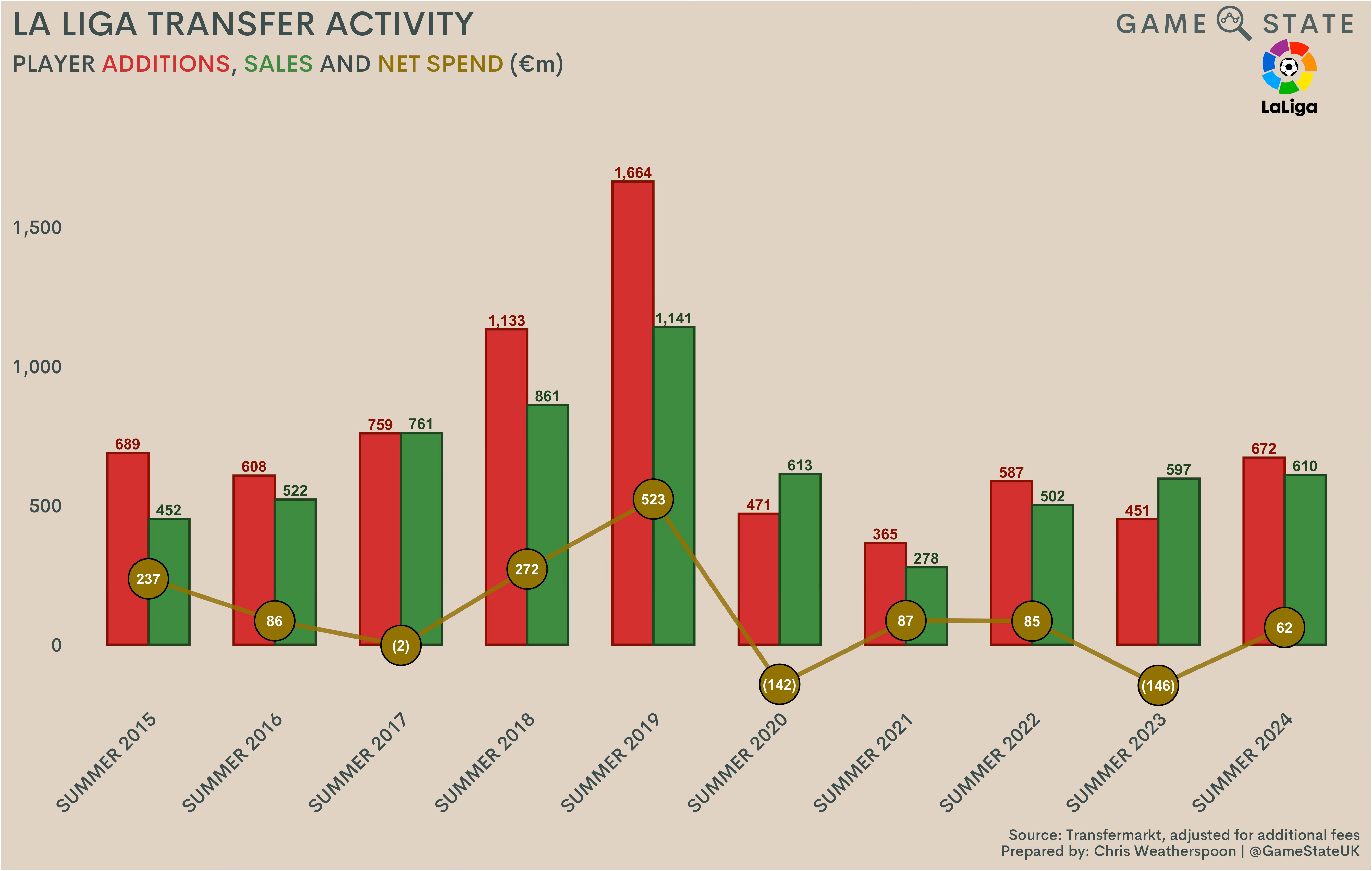 The contrast pre- and post- that ruling three years ago is stark. Gross spend has ballooned, topping €300 million over the last two summers, and while clubs remain strong sellers of young talent, spend on a net basis has jumped markedly up too.