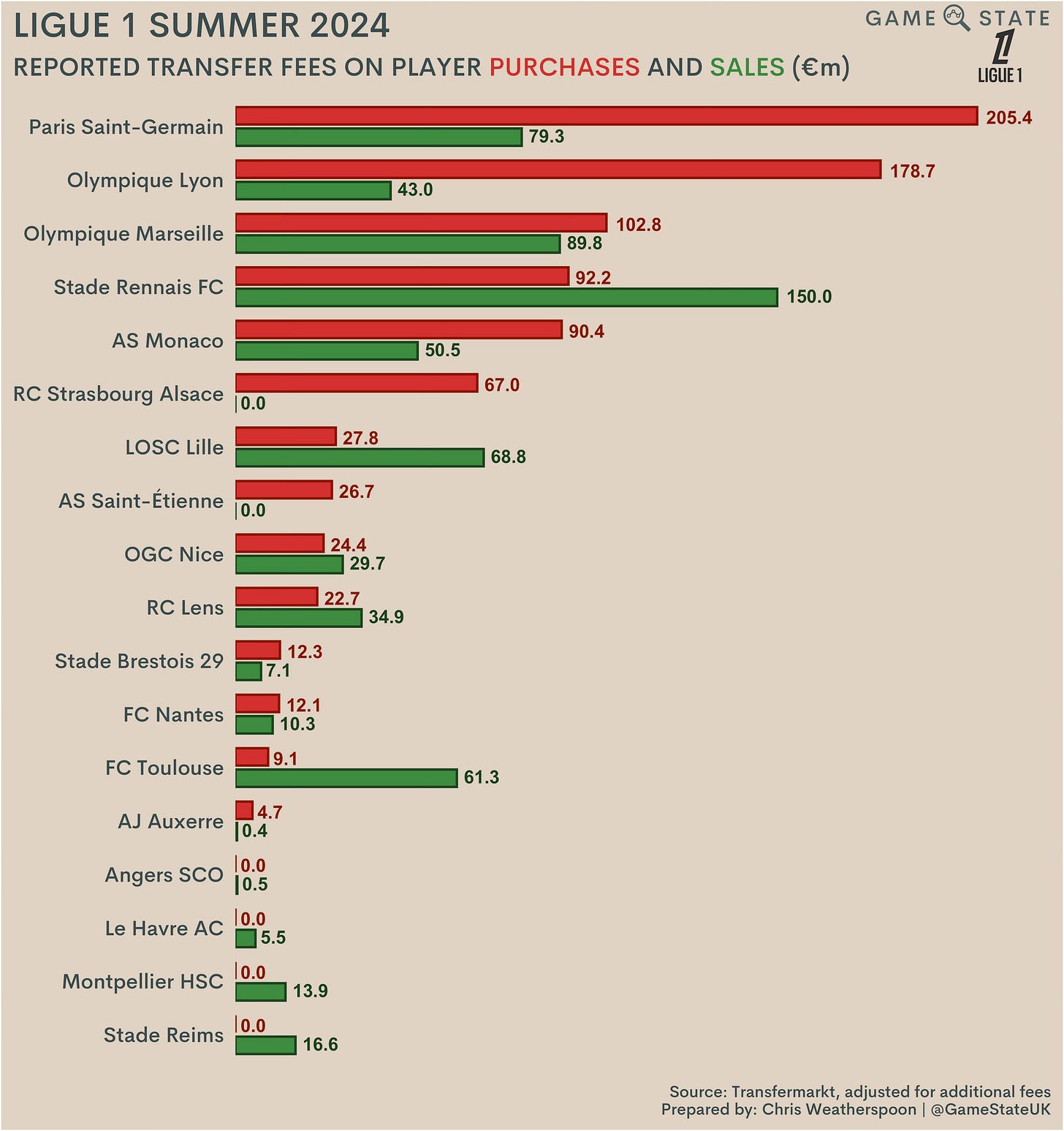 Four clubs in Ligue 1 didn’t spend a penny on new players. Stade de Reims were the lowest net spenders, which former manager Will Still might see as vindication following his decision to leave the club earlier this year, ostensibly due to dismay at their transfer policy.