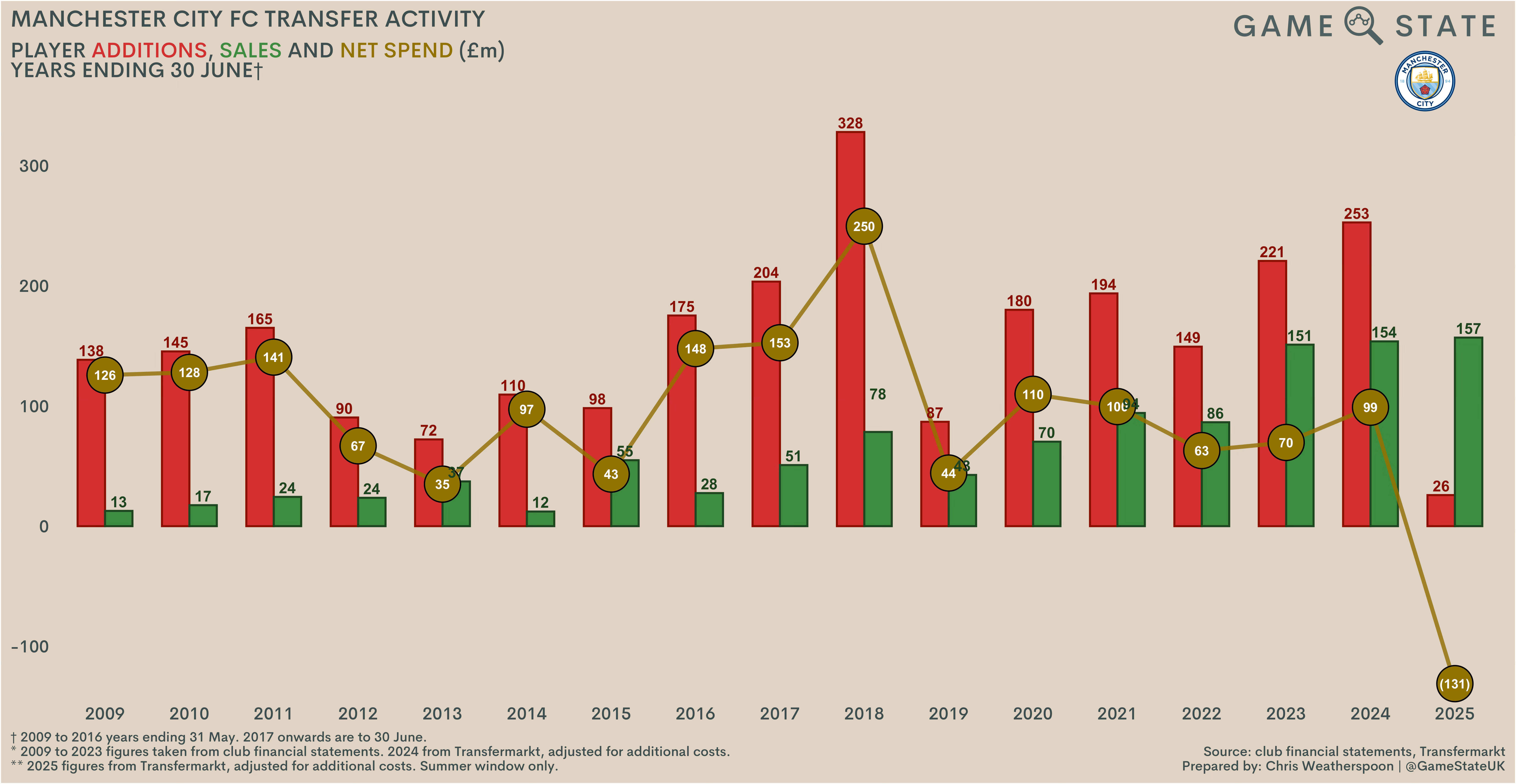 In a significant break from the past, Manchester City had the lowest spend, on both a gross and net basis, of any EPL club this summer. More notably - despite it going by and large unnoticed - the current season looks set to be the first since the club were taken over in 2008 where they will receive more on player sales than they will spend on incoming transfers.