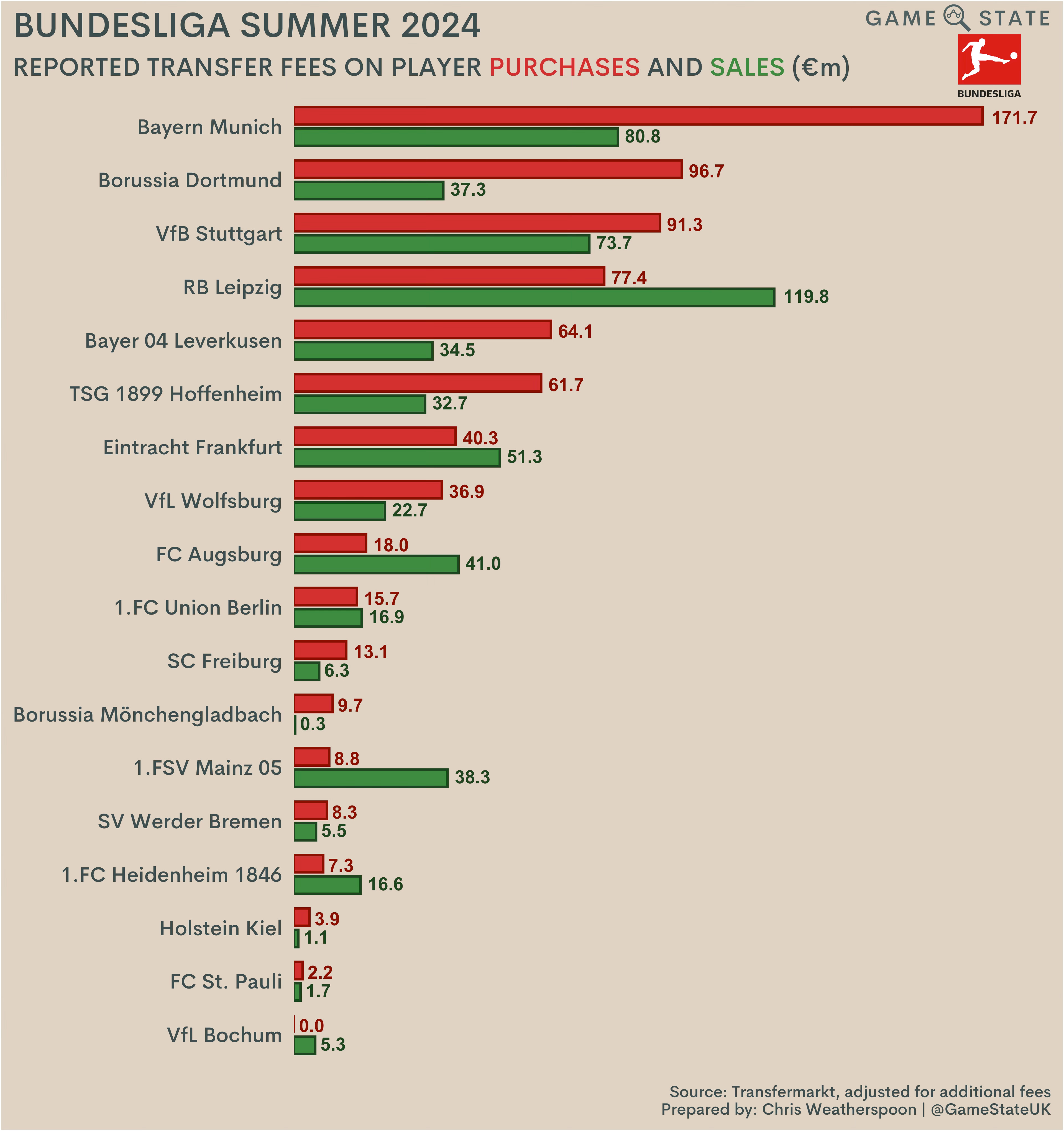 Stuttgart were the division’s third-highest sellers (€74 million), topped only by Bayern (€81 million) and RB Leipzig (€120 million), who booked nine figures in sales for the third time in the last four summers.