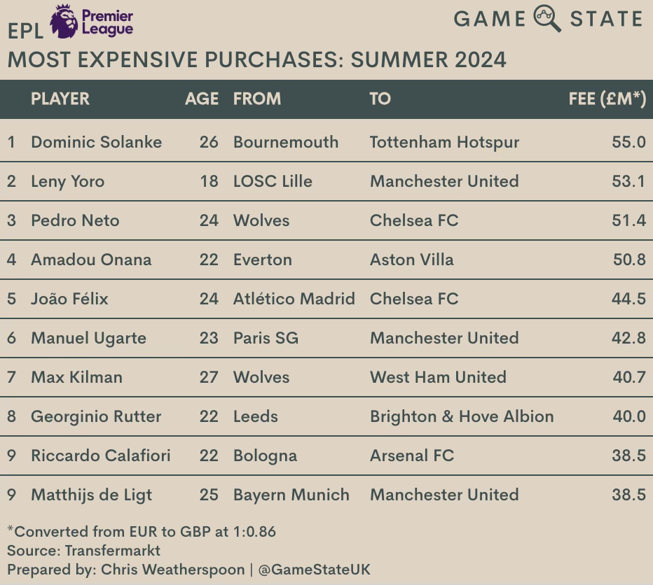 In terms of the biggest deals made where EPL clubs were buyers, Tottenham’s yearlong wait to replace Harry Kane ended with the £55 million capture of Dominic Solanke from Bournemouth. Five of the seven most expensive deals were intra-EPL ones, albeit unlike in many other leagues there was a decent spread of teams doing the buying.