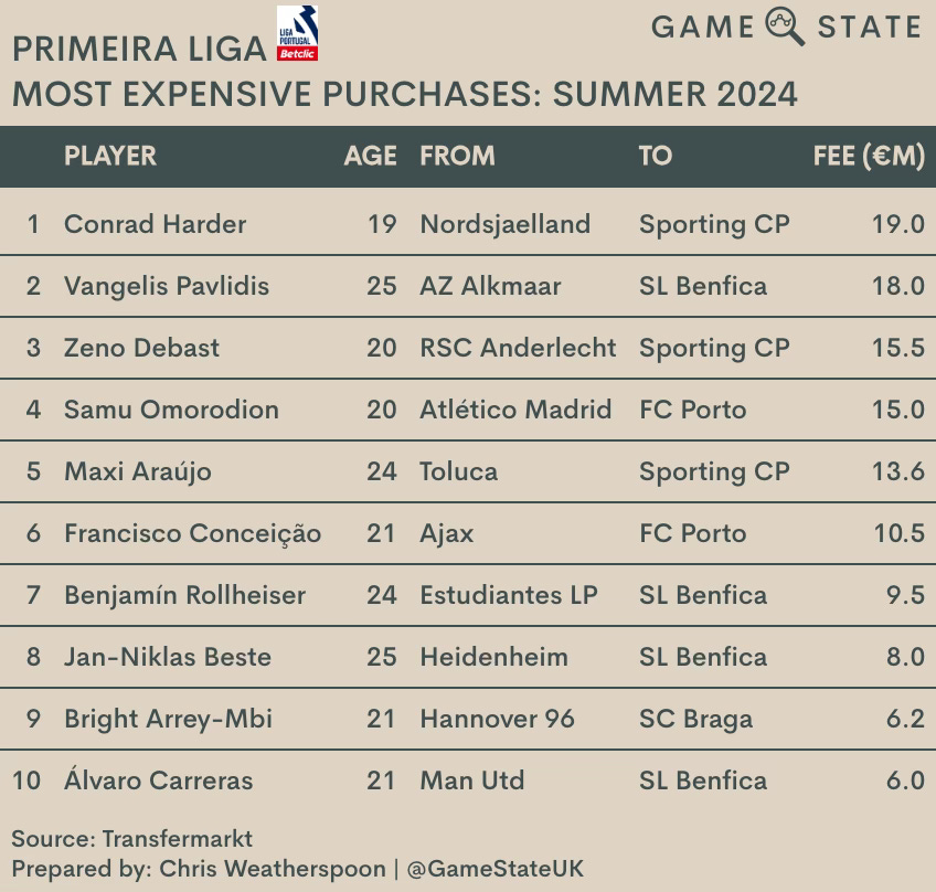 The last club to win the Primeira Liga not named Benfica, Sporting or Porto were Boavista, 24 years ago. Given the transfer activity on display both this summer and previously, that record doesn’t look like ending any time soon. Between them, Portugal’s ‘big three’ accounted for 80 per cent of player purchases this summer.
