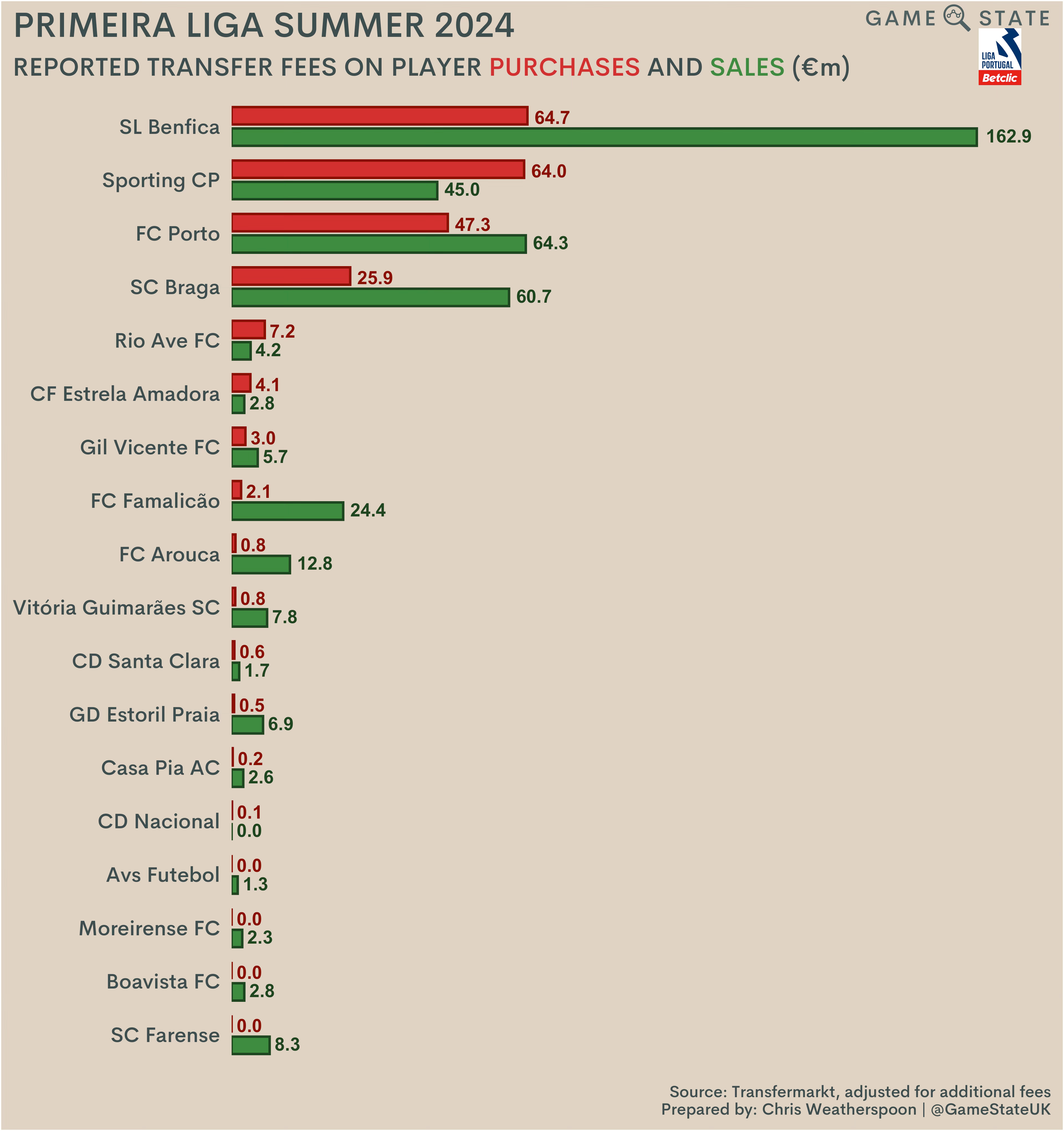Add in SC Braga and that figure rises to 91 per cent, showing the clear disparity that exists within Portugal’s top flight. In fact, of the 18 top tier clubs, 10 didn’t spend over €1 million in transfers this summer. Sizeable sales were thin on the ground too, though FC Famalicão did bank €12 million from Villarreal for goalkeeper Luiz Júnior, while FC Arouca pocketed a healthy €10 million for Spanish striker Rafa Mujica from Qatari side Al-Sadd.