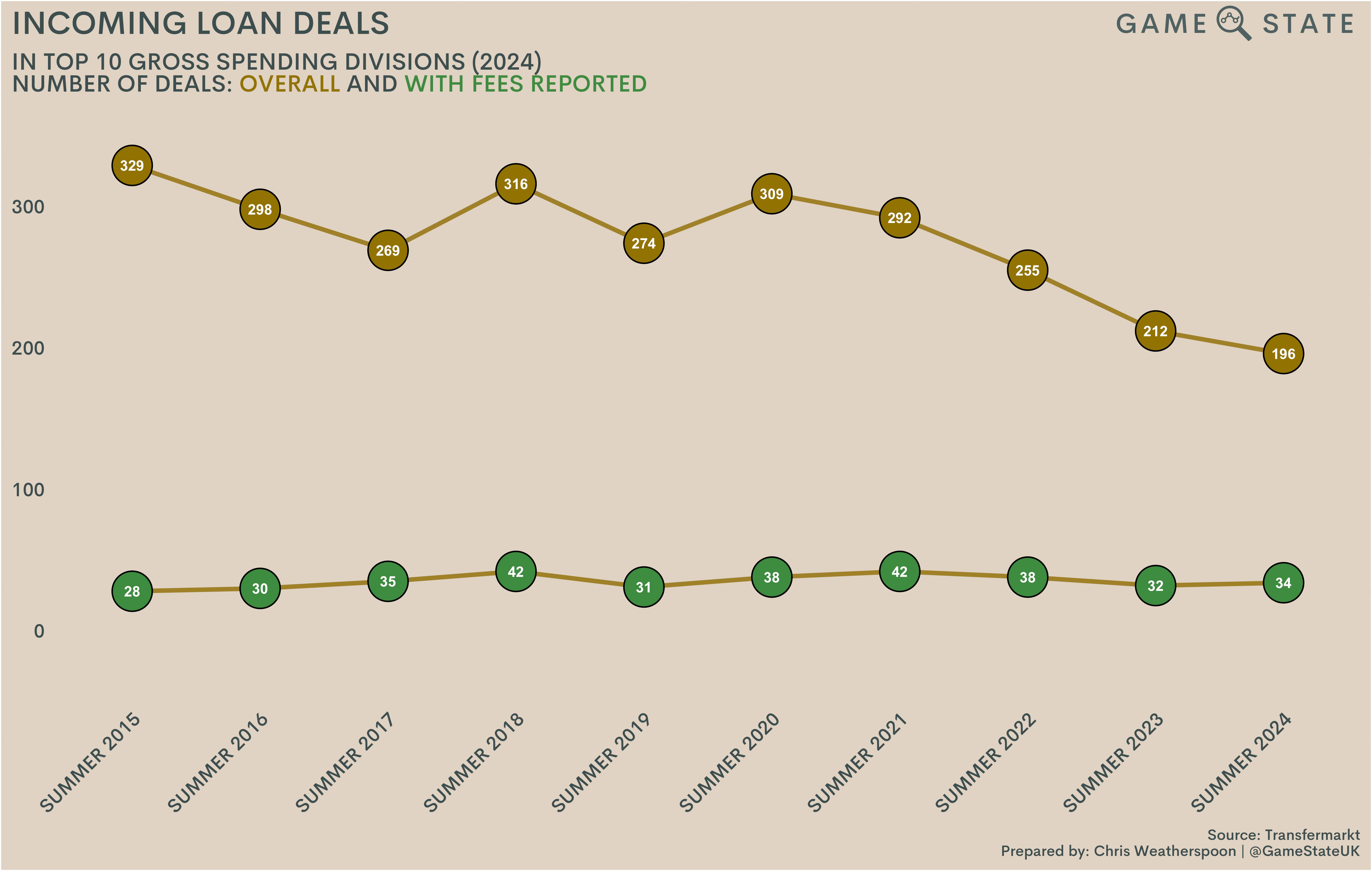 Permanent deals dominate headlines, but one noteworthy development concerns football’s loan market. While our analysis has only considered the 10 highest-spending leagues this summer, it does highlight a clear downturn in the total number of incoming loan deals agreed by clubs across those 10 divisions.